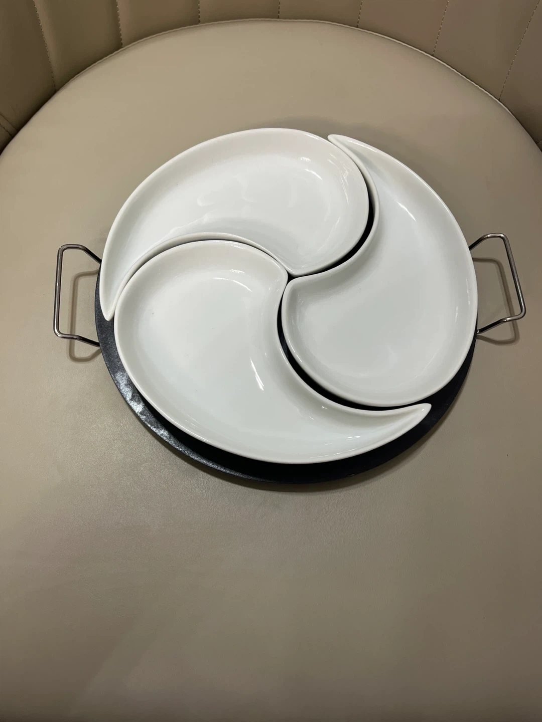 This serving set includes a black base with handles and three white ceramic dishes. The dishes are shaped to fit together on the base. Dishwasher & microwave safe.