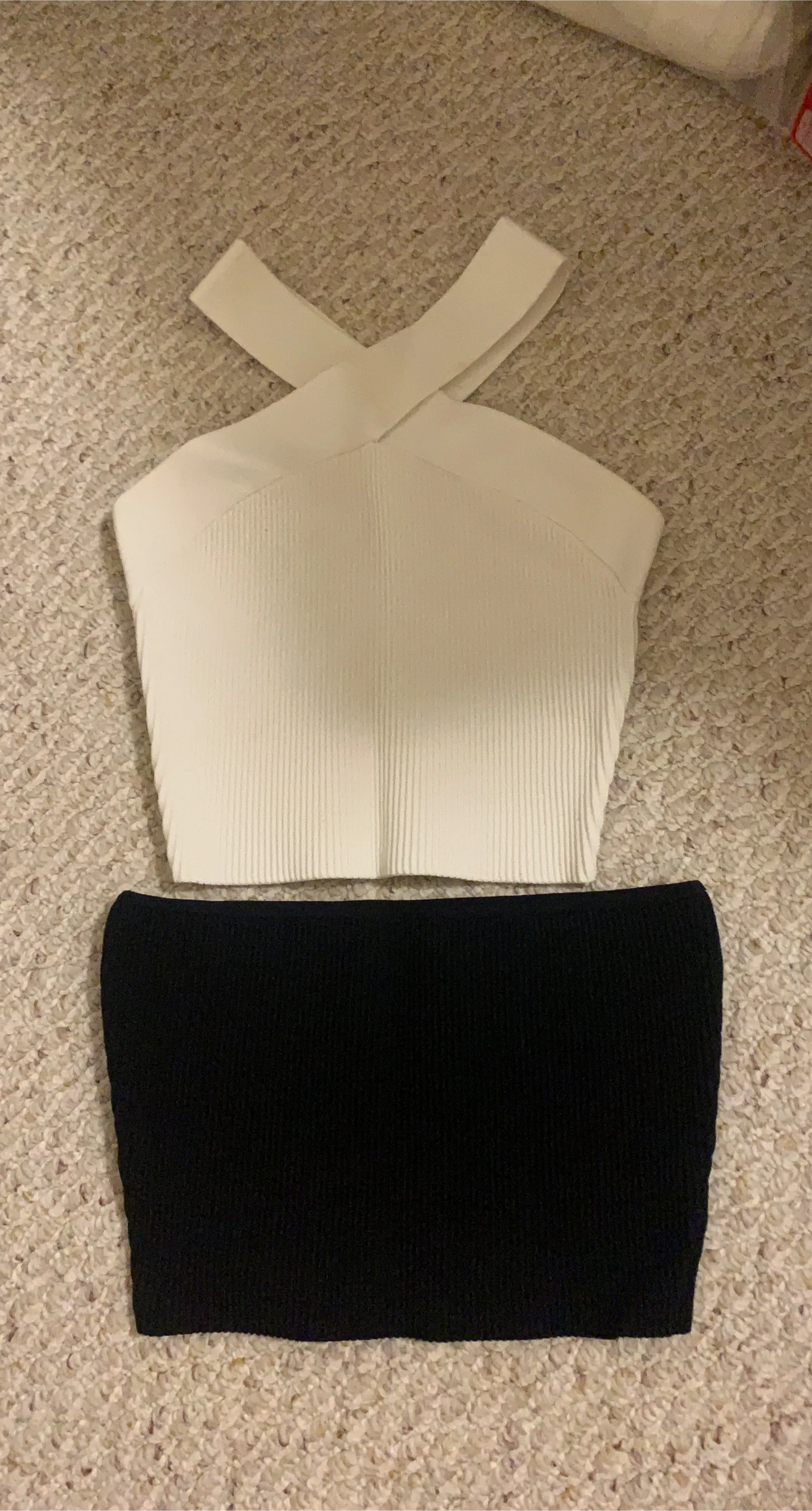 This set includes a white ribbed halter neck crop top with a criss-cross detail. It's paired with a black ribbed bandeau top. Both are made from a stretchy, ribbed knit material. Great for layering or wearing on its own! Total retail price around 80-90