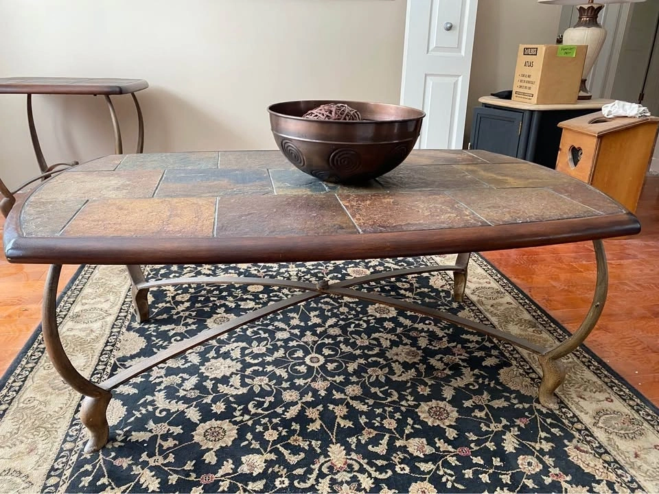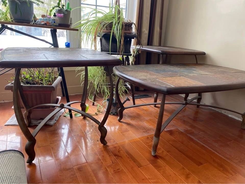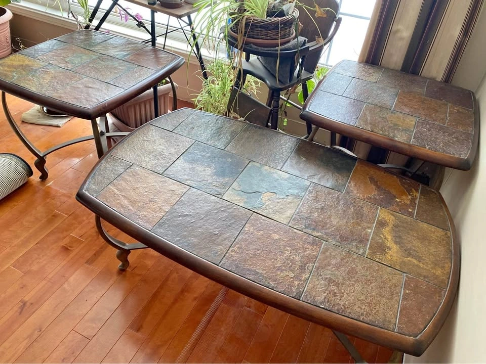 Solid construction tables with slate top and metal legs. Rounded edges so safe around children. Easy to clean up spills. No worries of rings or stains from water spills etc. Coffee table dimensions: Length 51”, height 20.5”, Width 32”. Two side/end tables: length and width 28 ”, height 26”. Pick up in Lynden from smoke-free home. (We are part of city of Hamilton and are between Dundas and Brantford)