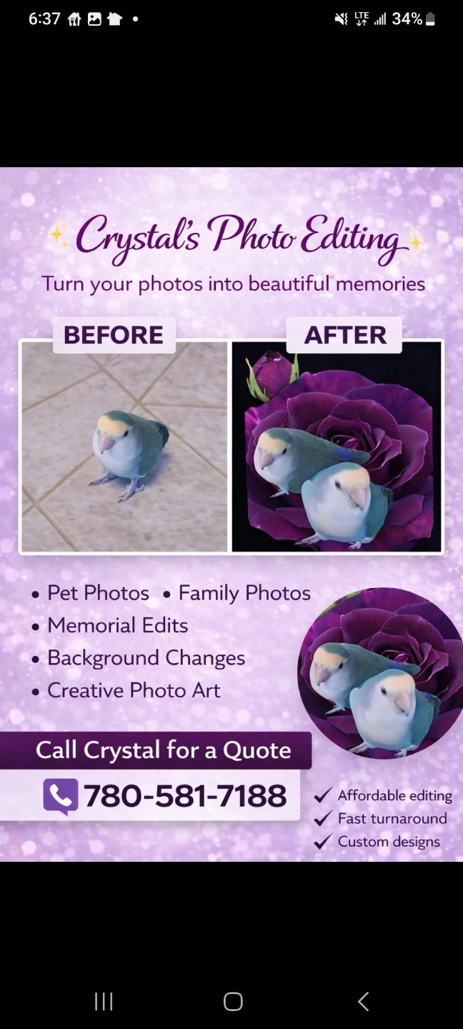 Turn your photos into beautiful memories with custom photo editing. Services include pet photos, family photos, memorial edits, background changes, and creative photo art. Fast turnaround and affordable editing available. Call Crystal for a quote!