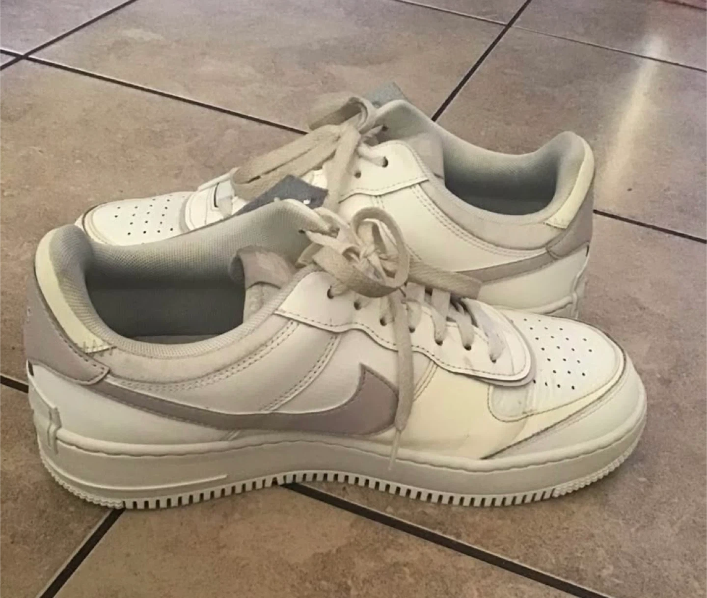 White and light grey Nike Air Force 1 Shadow women's sneakers. Leather upper with classic Nike Air cushioning. These are a stylish choice for everyday wear!
