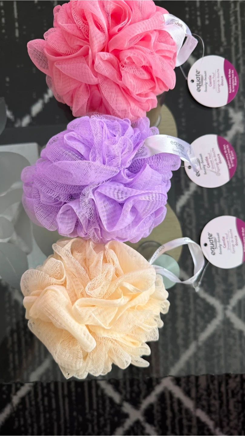 This is a set of three Equate shower poufs in pink, purple, and beige. They're made of mesh and come with a hanging loop.