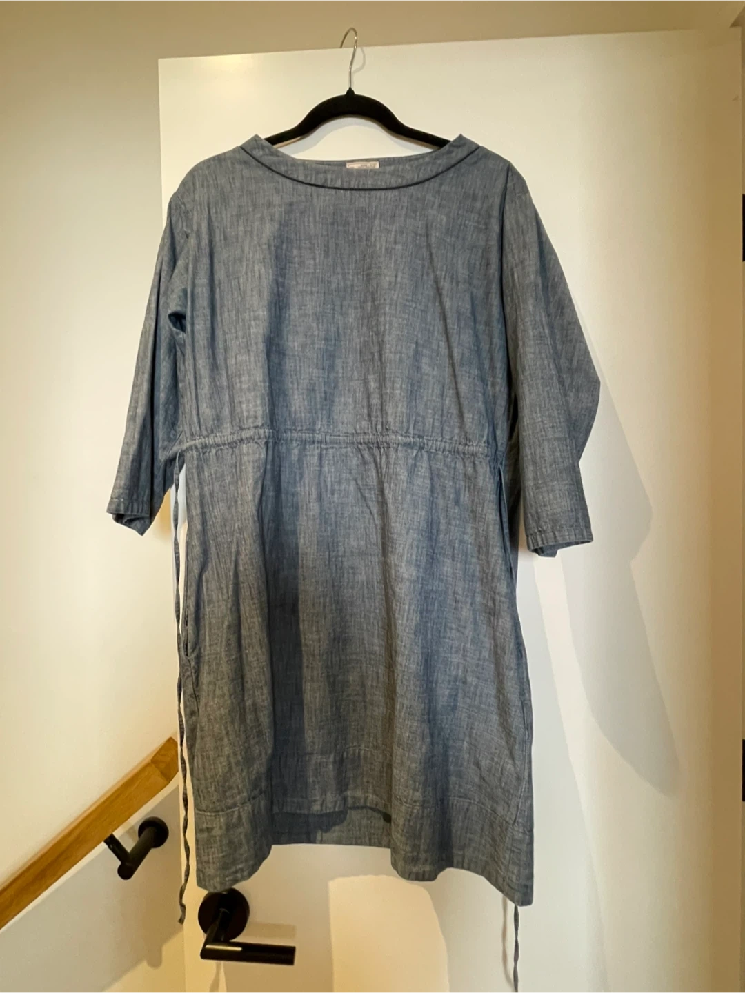 This dress features a relaxed fit with a drawstring waist for adjustable sizing. Pockets are included on the sides.