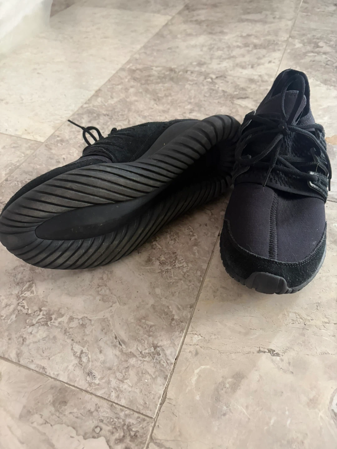 These are black Adidas Tubular Radial athletic shoes. They are a size 9 US men's. Open to offers!