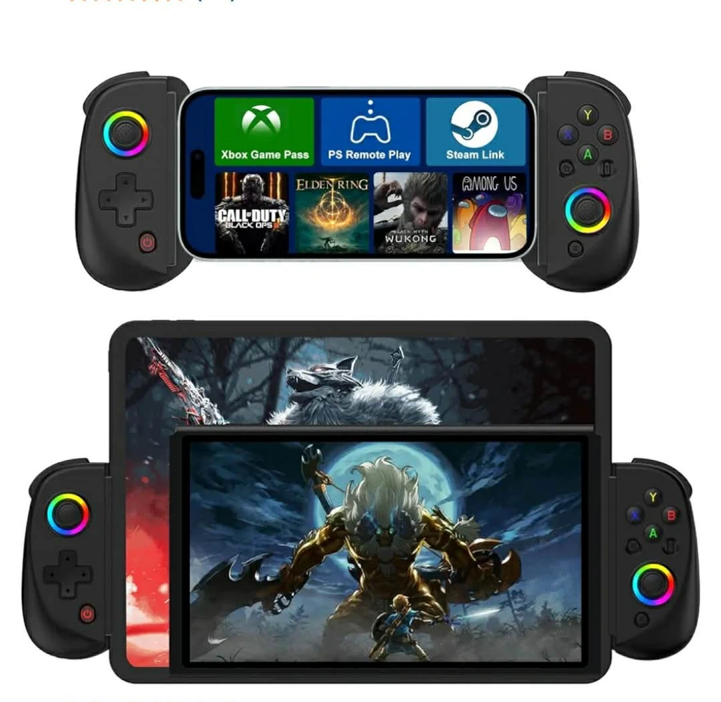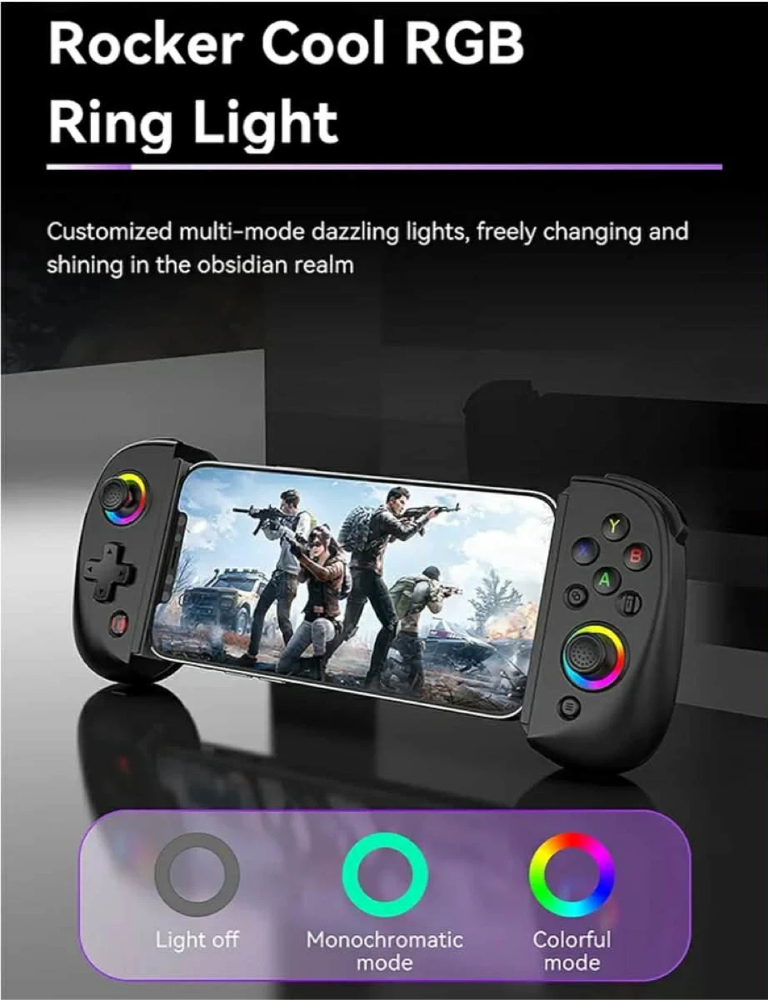 This is the BSH D8 wireless controller for mobile devices. It features RGB ring lights with multiple modes, including light off, monochromatic, and colorful. This controller supports iOS/Android phones and tablets, MacBooks, PCs, and is also compatible with Switch/OLED/Lite, PS3/PS4, and Xbox One/Series. It connects via Bluetooth for most devices and wired for PS3/PS4. The controller has a turbo burst function and can be used as a handheld gaming device.