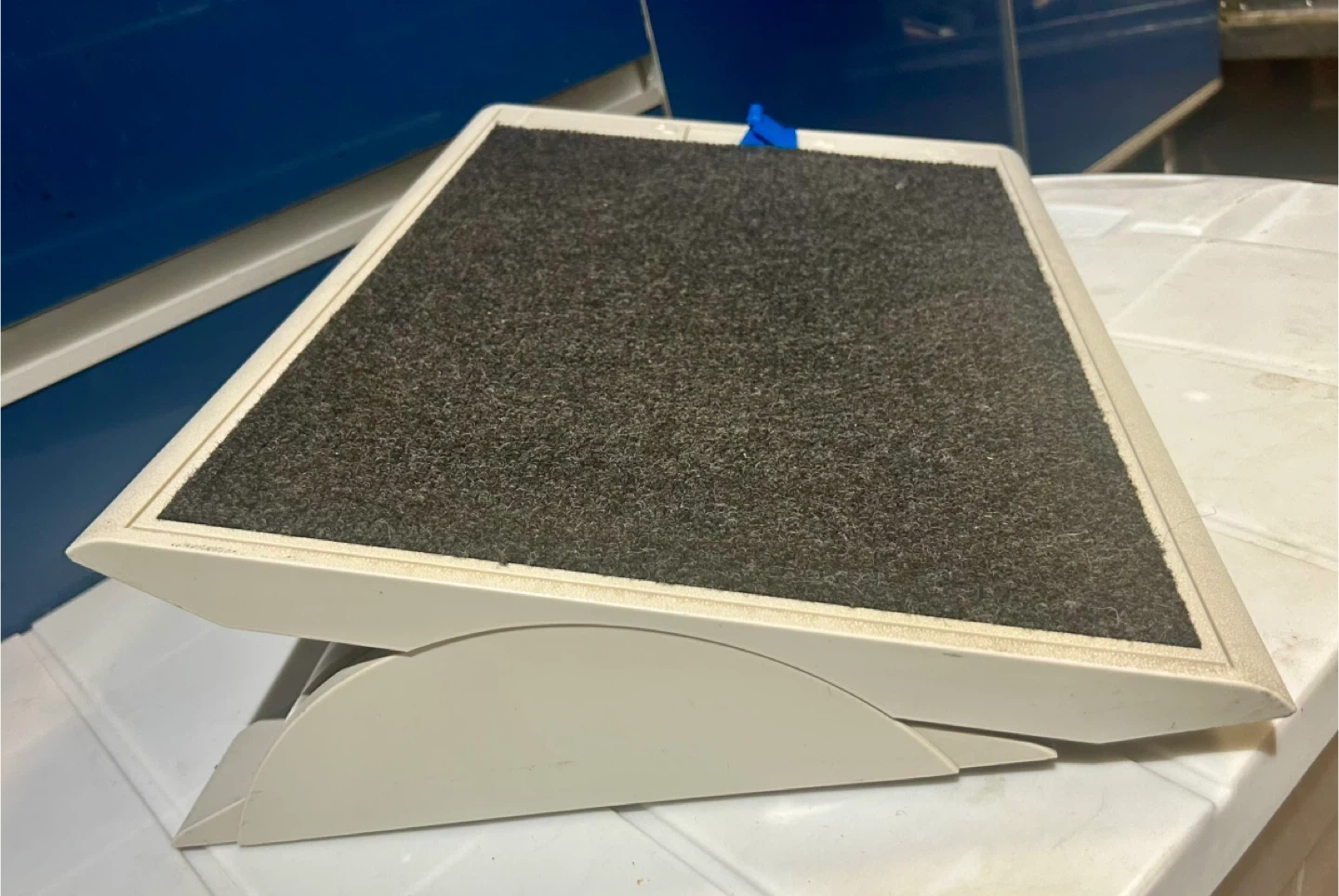 This is an adjustable footrest designed to enhance your ergonomic setup. The footrest is in used condition but still provides excellent support and comfort. It features a textured surface to prevent slipping and an adjustable angle for personalized comfort.