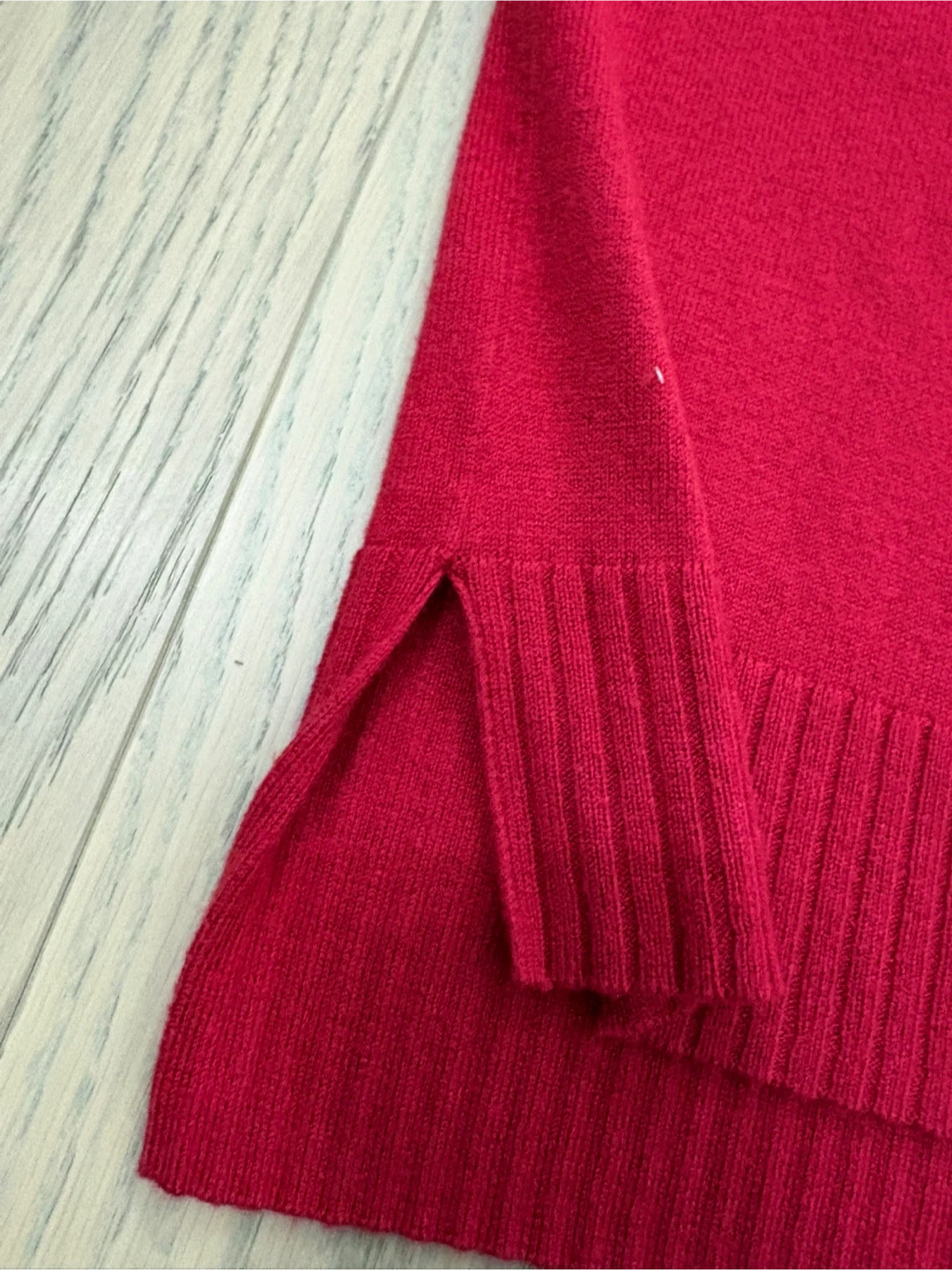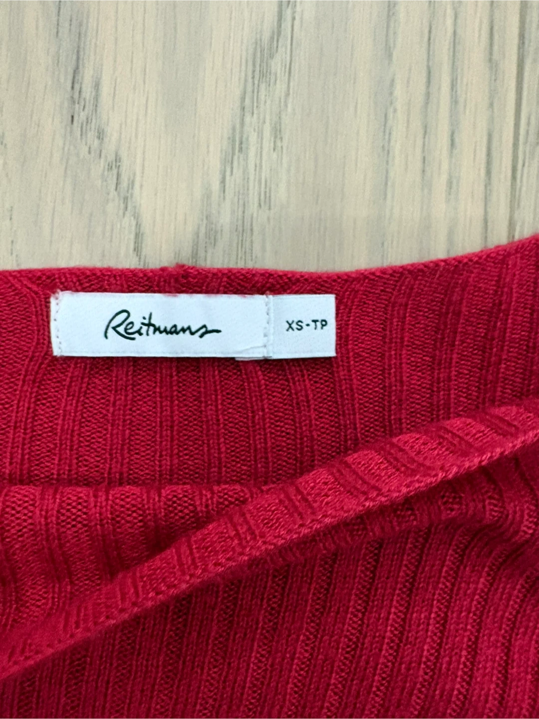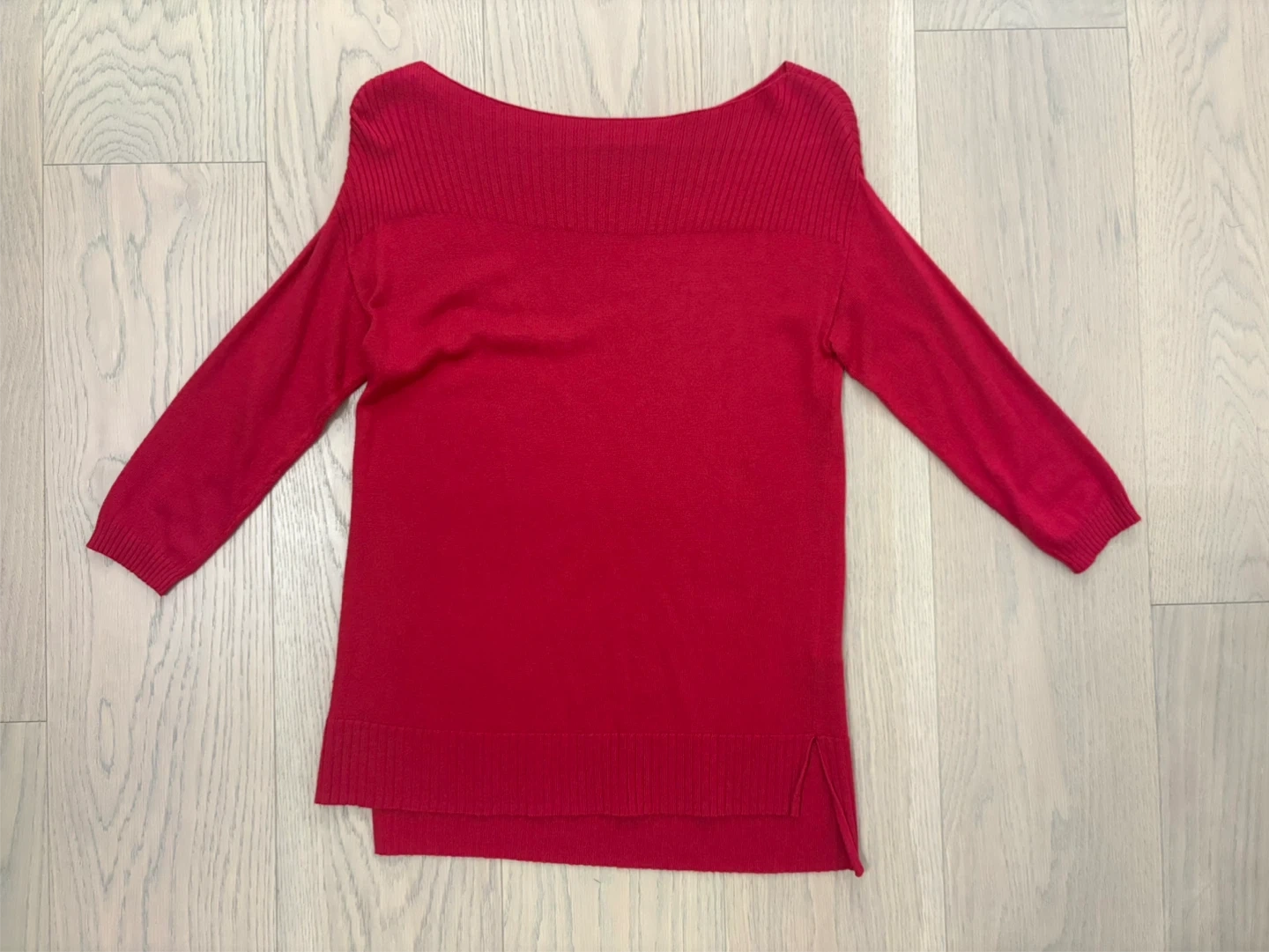 This is a Reitmans 3/4 sleeve red sweater. It's a size XS. The sweater is made of a knit material and features side slits at the hem.