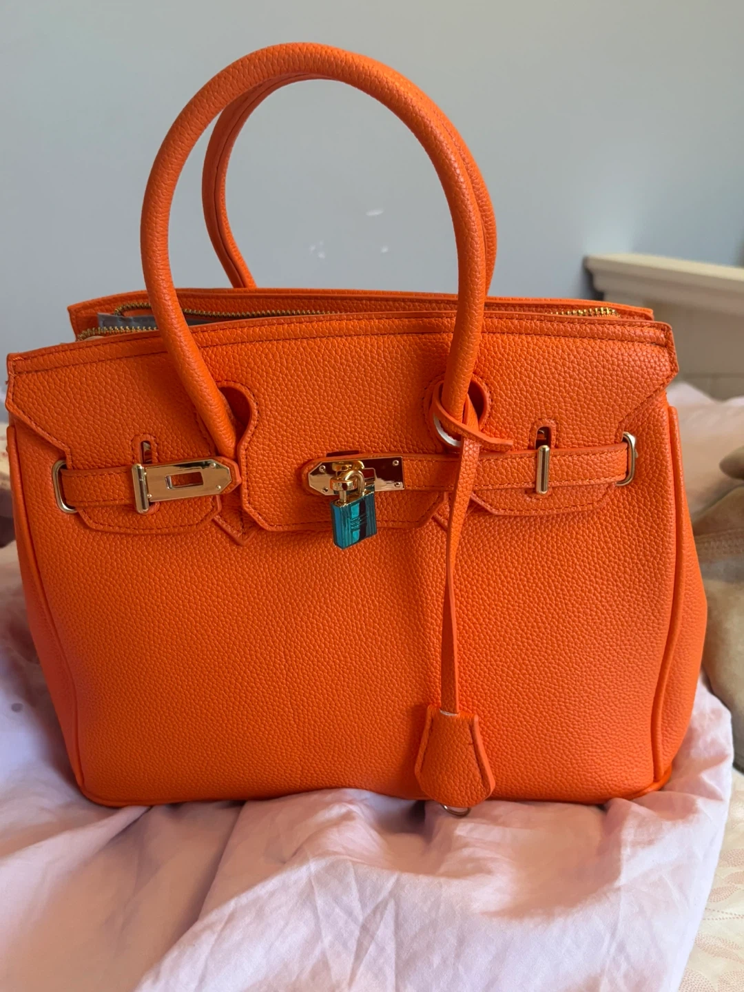 A textured orange tote handbag with gold-tone hardware. It has a top zip closure and dual top handles. Includes a small padlock and keys.