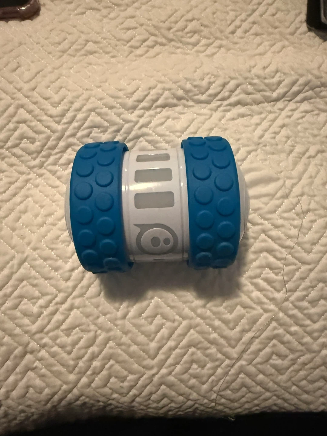 This is a Sphero Mini robot toy, a compact and fun app-controlled device. It's white with blue textured wheels for grip. Control it with your smartphone or tablet for various games and activities!