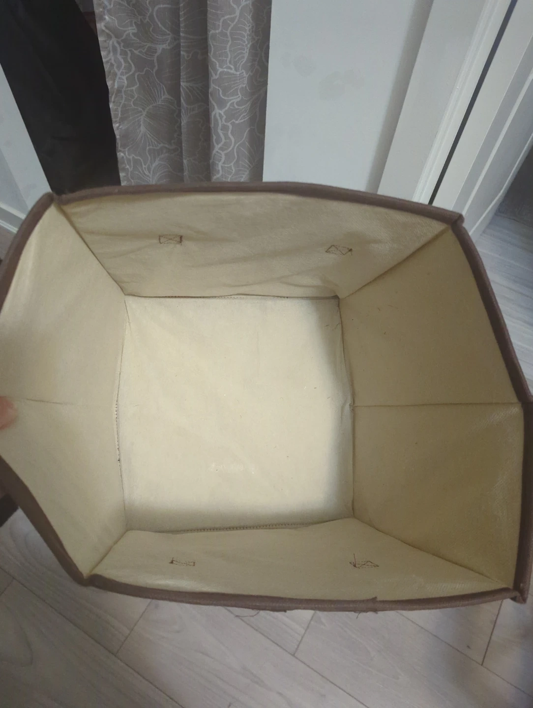 This is a collapsible storage bin, perfect for organizing your home. It's made of fabric with brown trim and features two side handles. When not in use, it folds flat for easy storage. Great for closets, shelves, or under the bed!