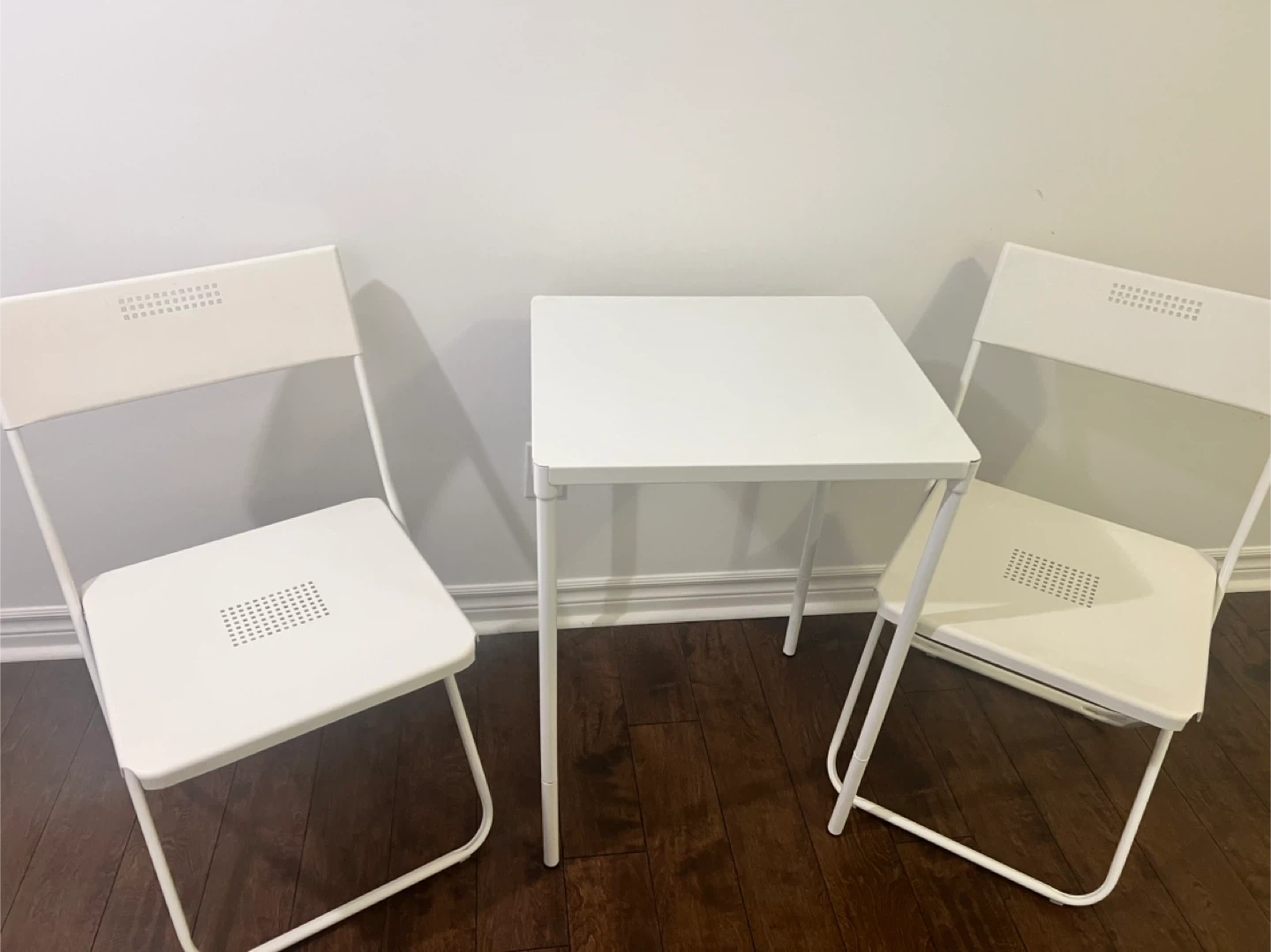 This is a white folding table and two chairs set. It's made of metal. The chairs and table are foldable for easy storage. These would be great for small spaces or for extra seating when needed!
