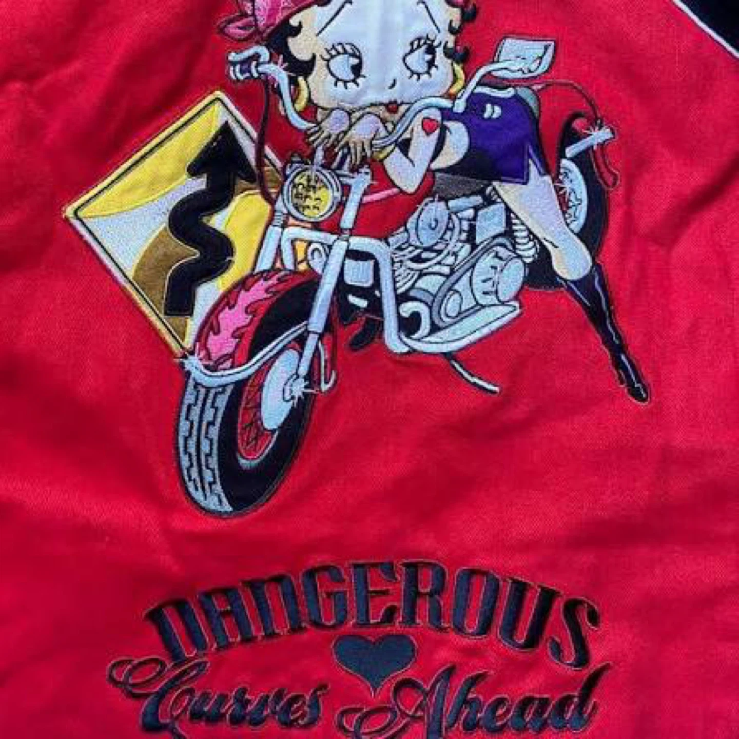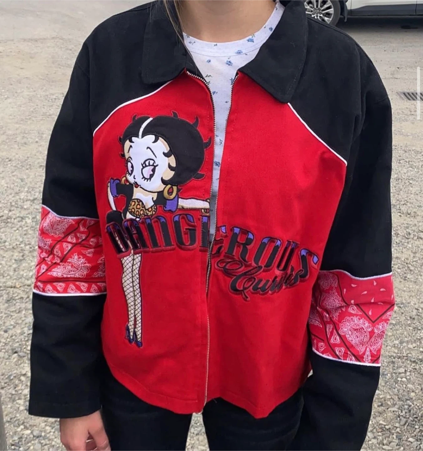 This Betty Boop jacket features "Dangerous Curves Ahead" embroidery and graphic print. It's black and red with bandana print accents on the sleeves. The lining is black satin with a subtle pattern. It's a unique piece for any fan!