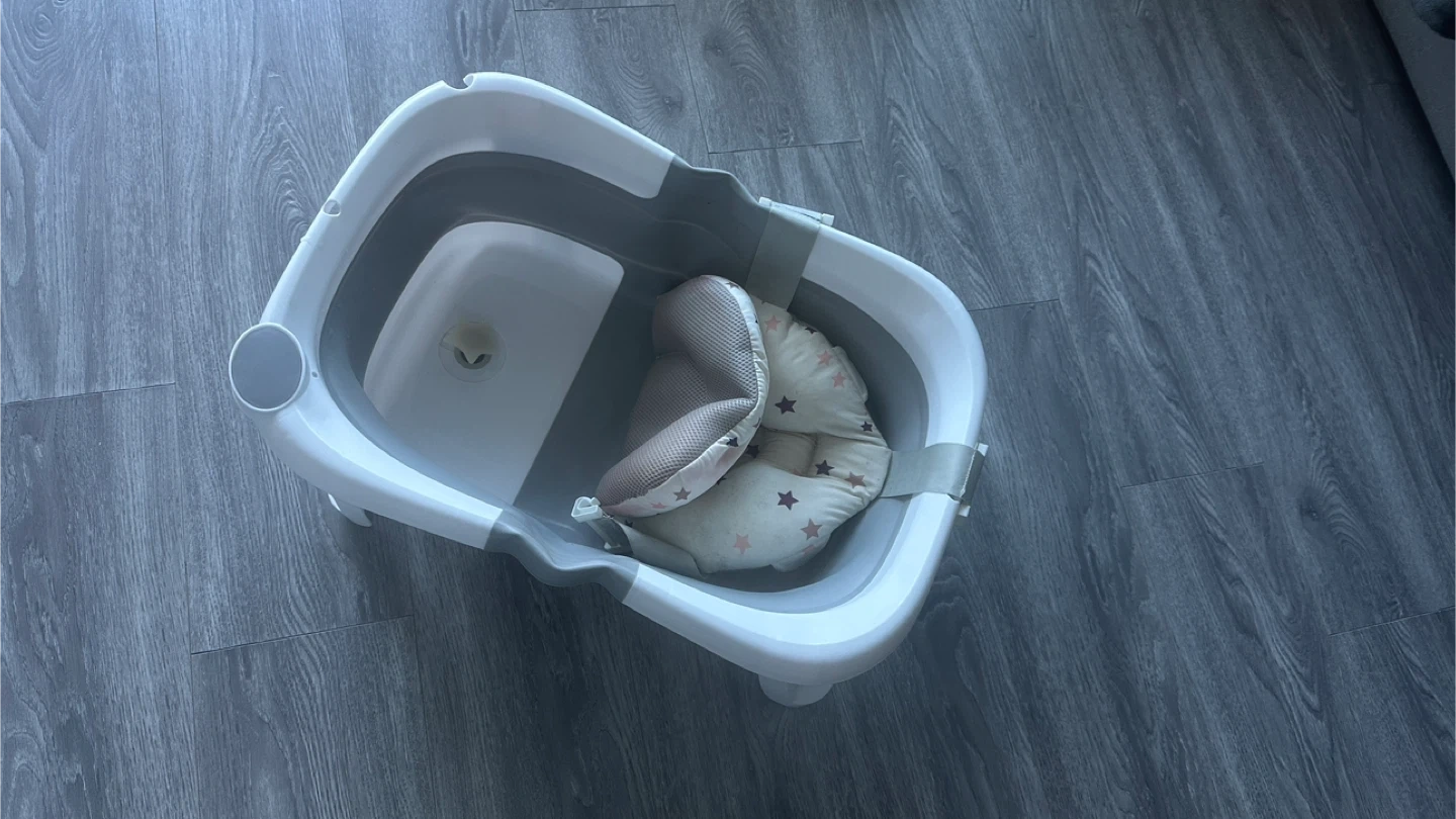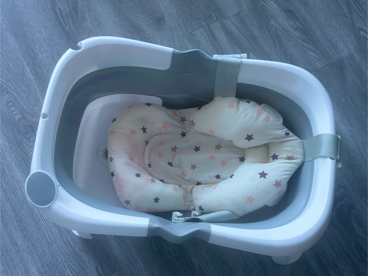 This handy collapsible baby bathtub is perfect for bathing little ones. It comes with a soft, star-patterned cushion for comfort. The tub is made of durable plastic and features a convenient drain plug.
