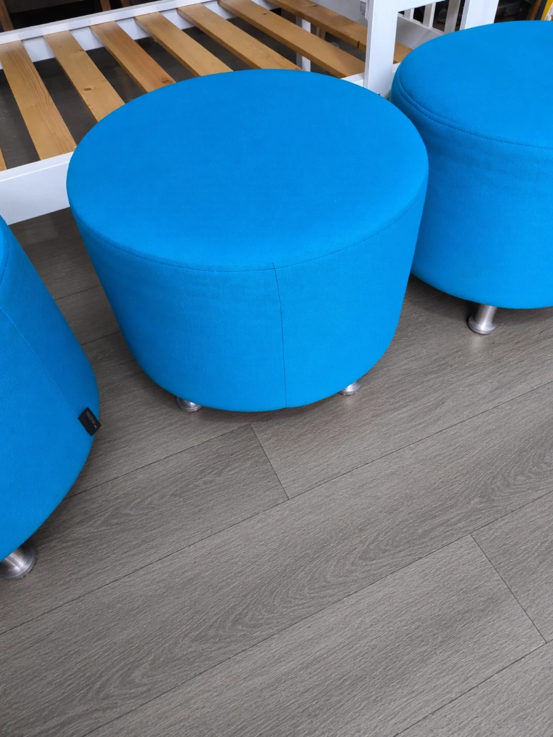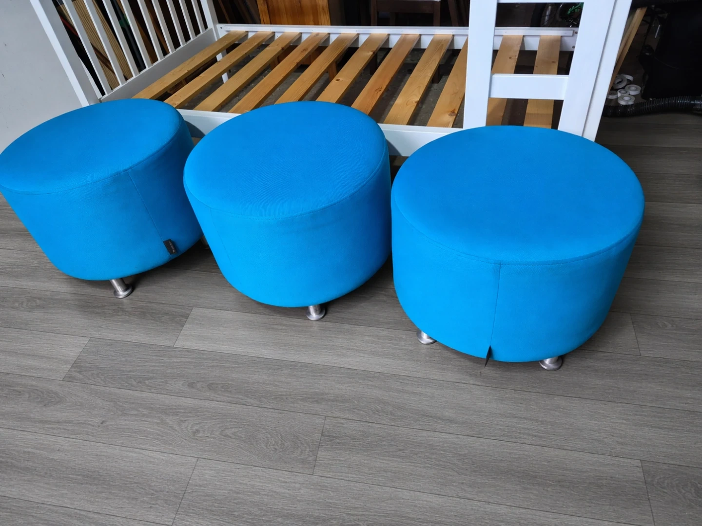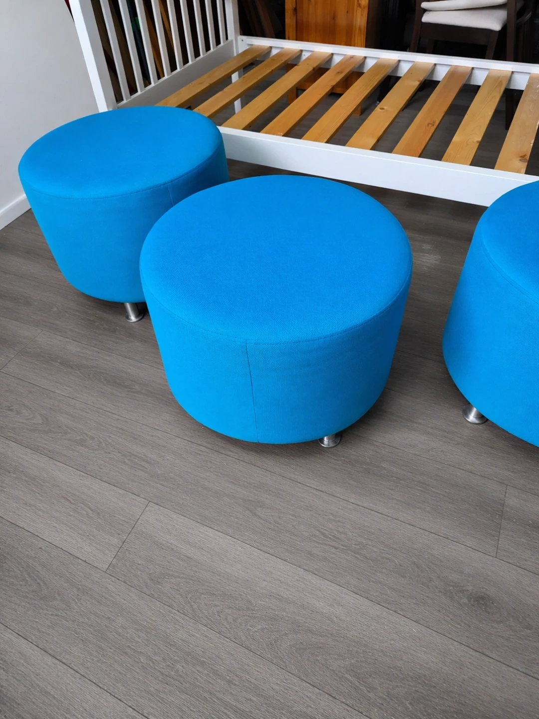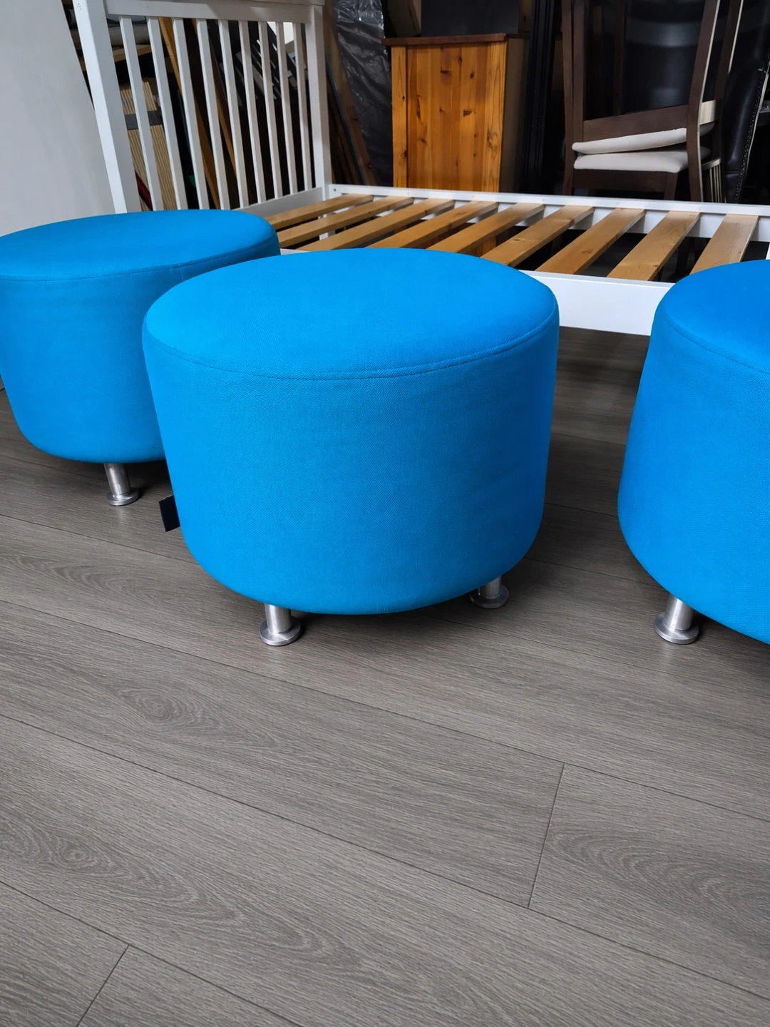 Set of three round, blue upholstered ottoman stools. They have silver coloured feet. These stools are great for extra seating or as footrests.