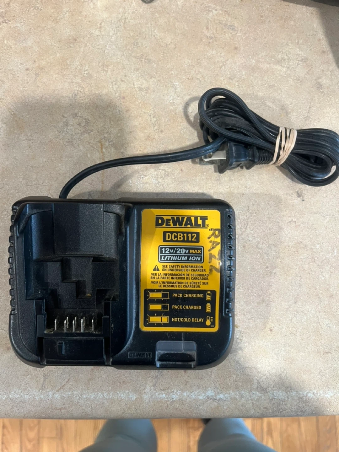 This is a DEWALT DCB112 charger for 12V and 20V MAX Lithium Ion batteries. It indicates charging status with pack charging, pack charged, and hot/cold delay indicators. It's a useful charger for your DEWALT power tool batteries.