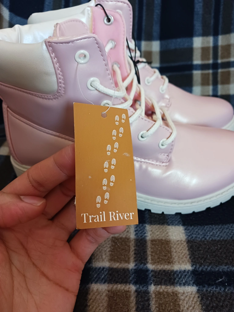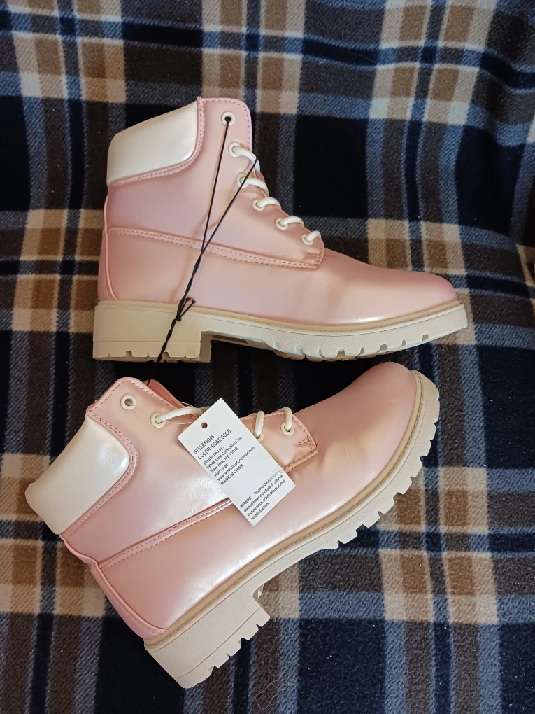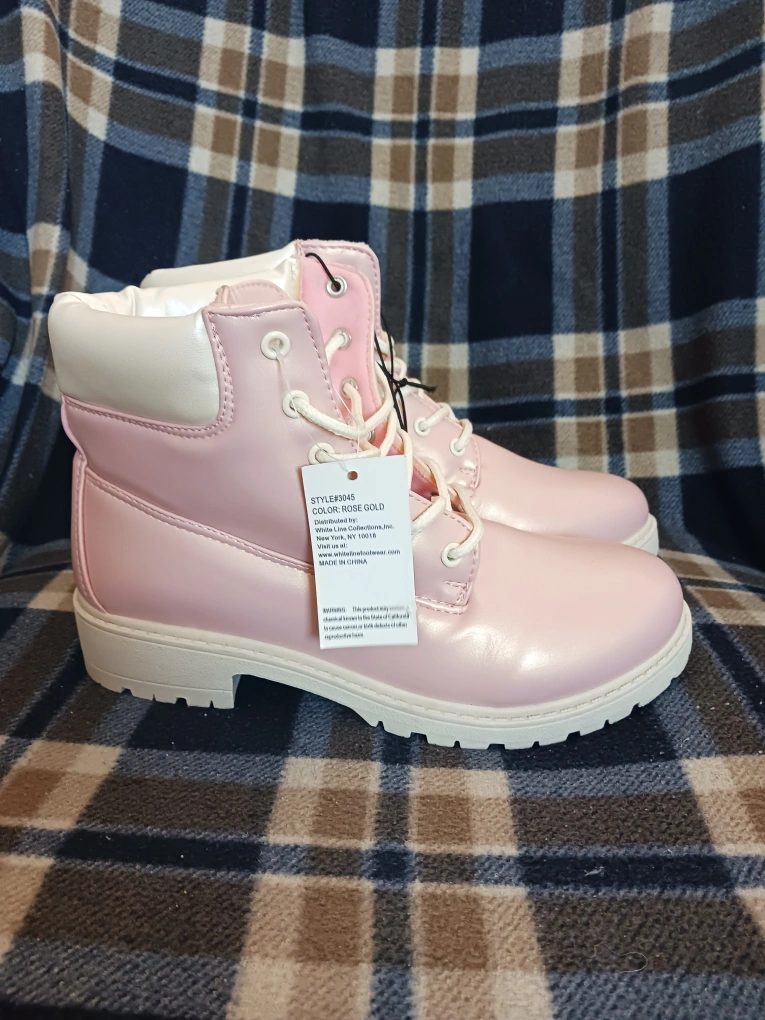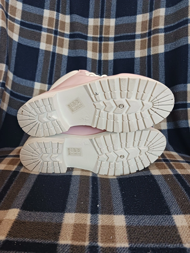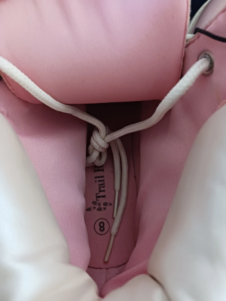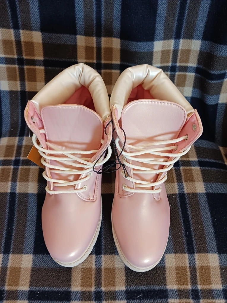 A lovely pair of pink boots. White soles and white laces. Comfortable white padding around the top. Consider these when you want to feel calm and serene.