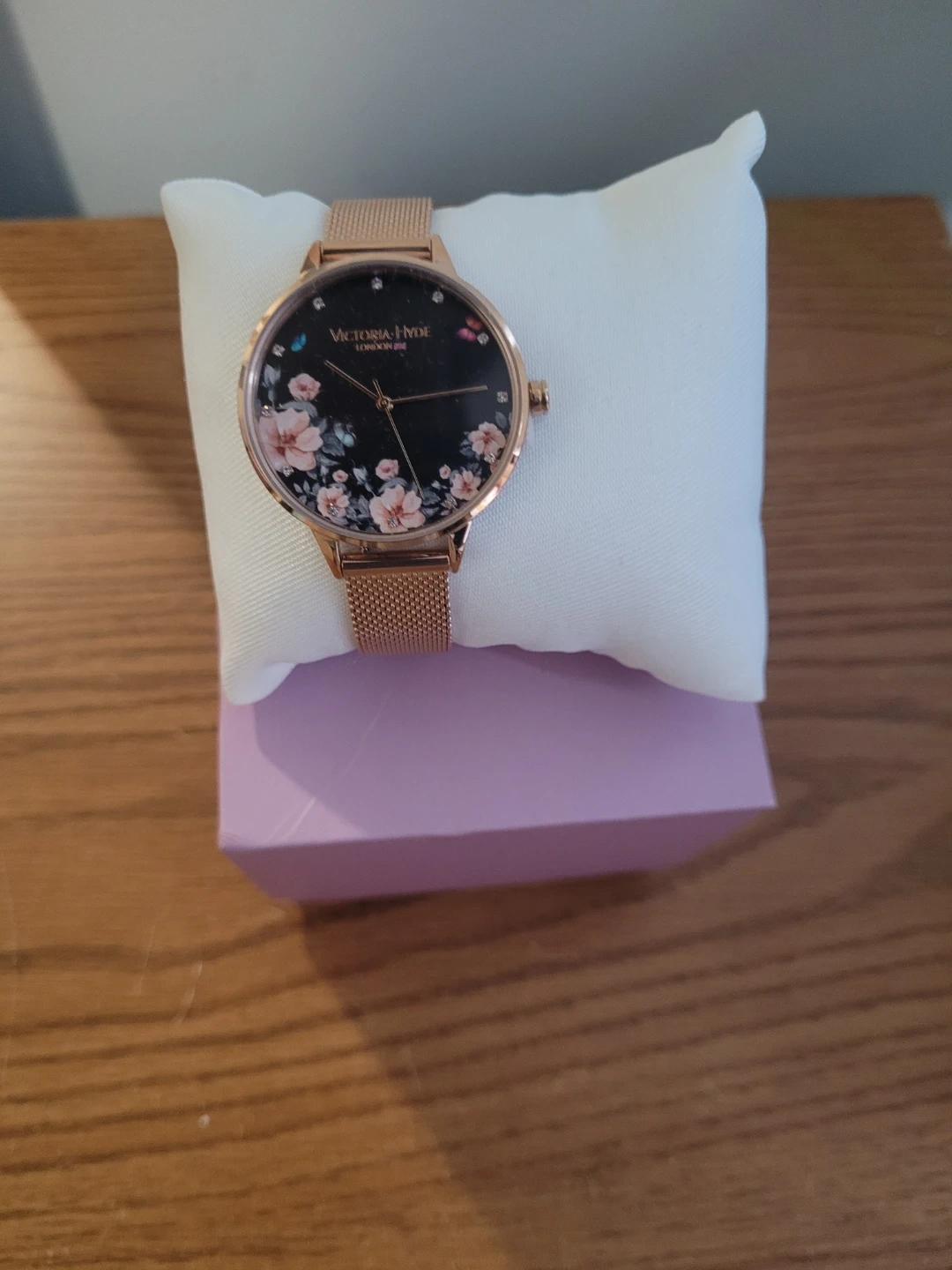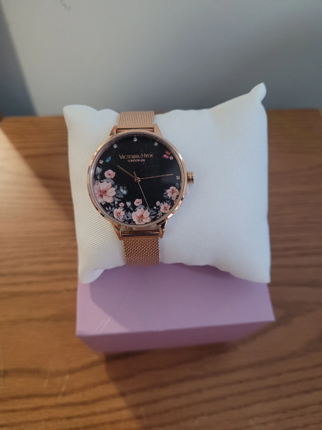I'm selling a Victoria Hyde London watch with a floral design on the face. It's rose gold coloured with a mesh strap. Comes in its original box. The box is kinda damaged.