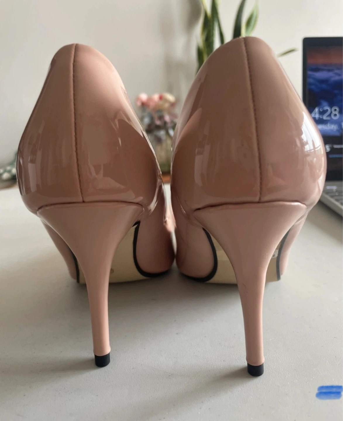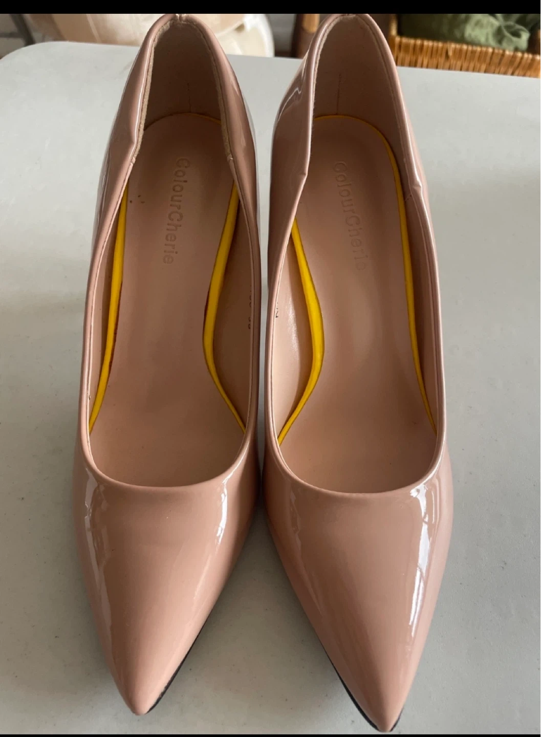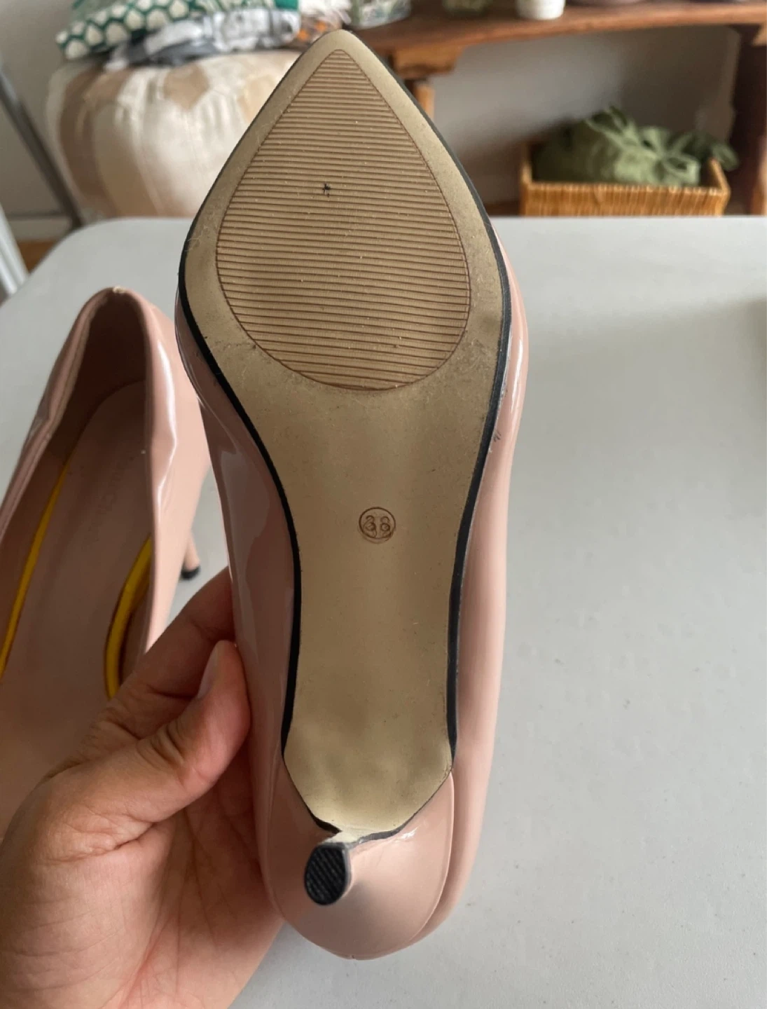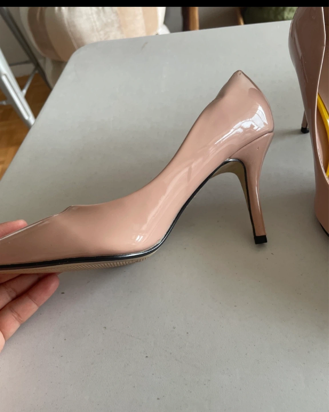 Pair of nude patent leather pointed-toe heels. Size 38 European. Slight heel. Yellow interior.