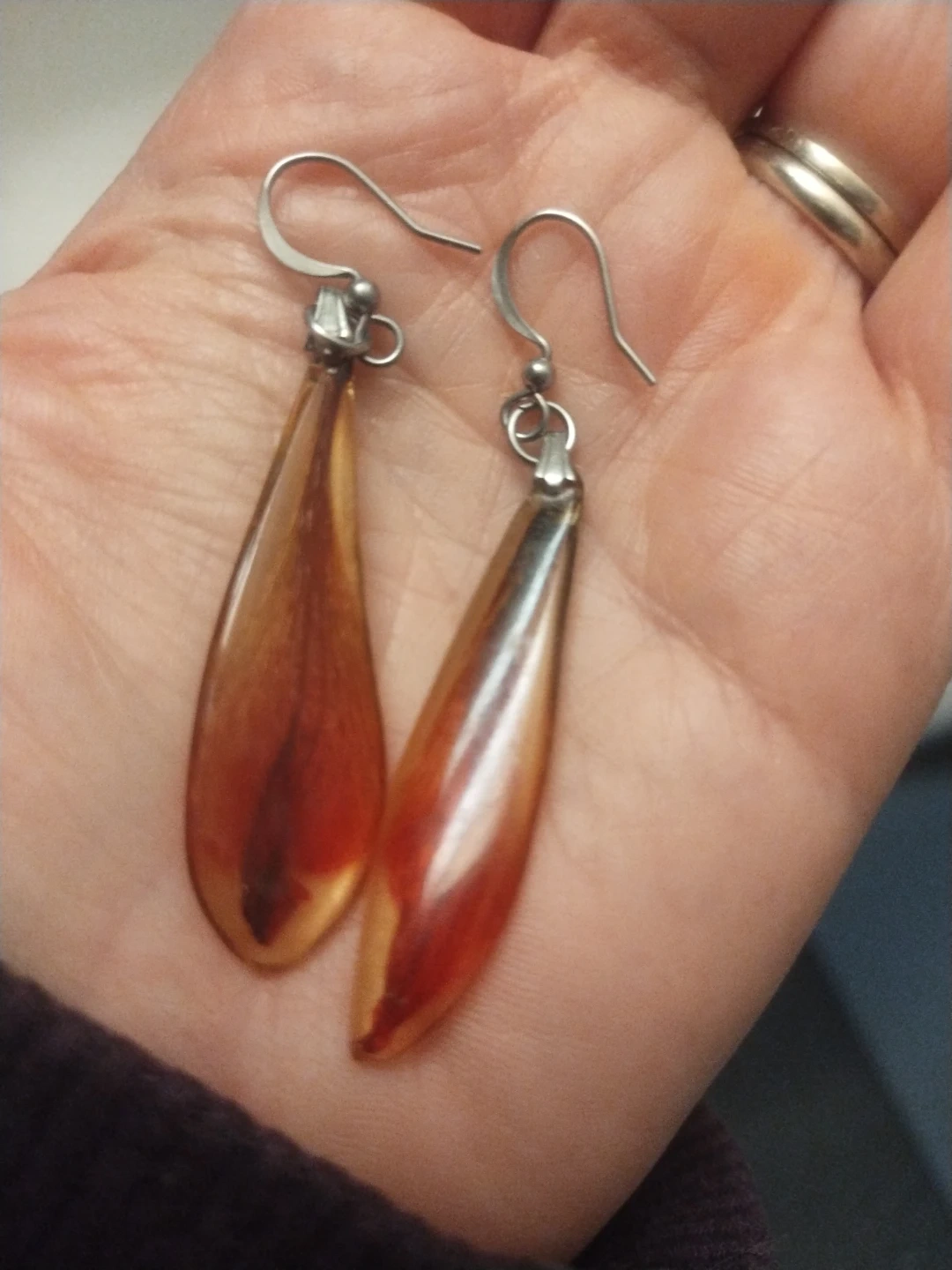 These elegant earrings feature a teardrop shape with a beautiful amber colour. The metal hardware appears to be silver-tone and is attached to a hook backing. They're perfect for adding a touch of vintage flair to any outfit!