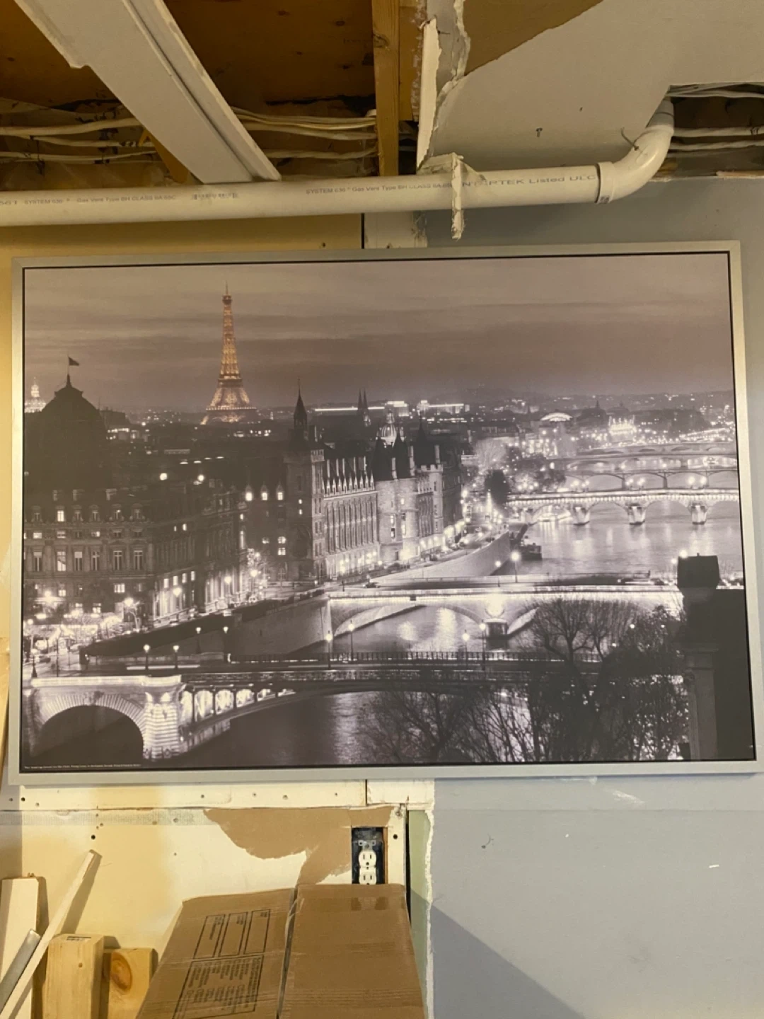 This framed wall art depicts the Paris skyline with the Eiffel Tower. Silver-toned frame. Approximate dimensions: 40 inches wide by 28 inches tall.$80.00 perfect condition , please excuse where it’s hanging , we are moving and just posting stuff , pick up in Newmarket