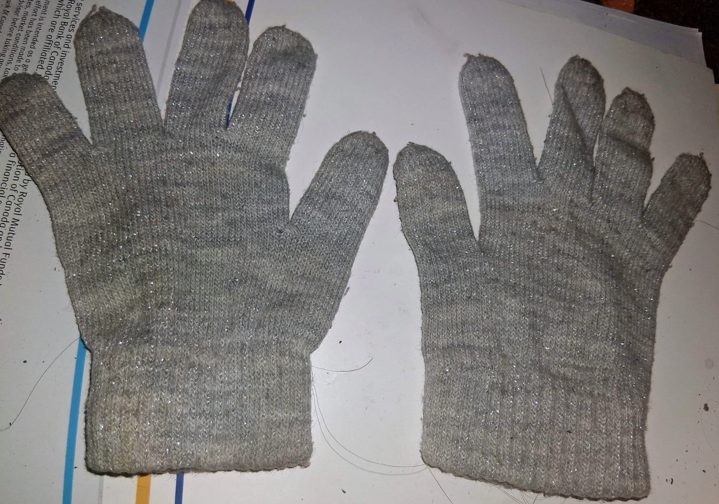 A pair of grey knit gloves with subtle sparkle threads. These gloves are made from a warm, textured knit material. They're designed for keeping hands cozy in cooler weather. Size Small. Pickup Only unless near intersection of Oxford and Gammage Street.