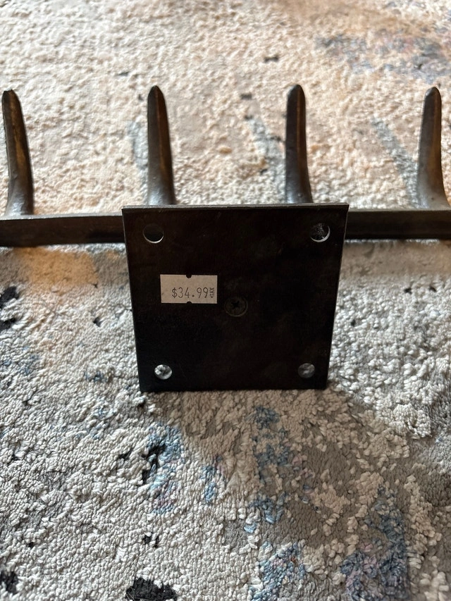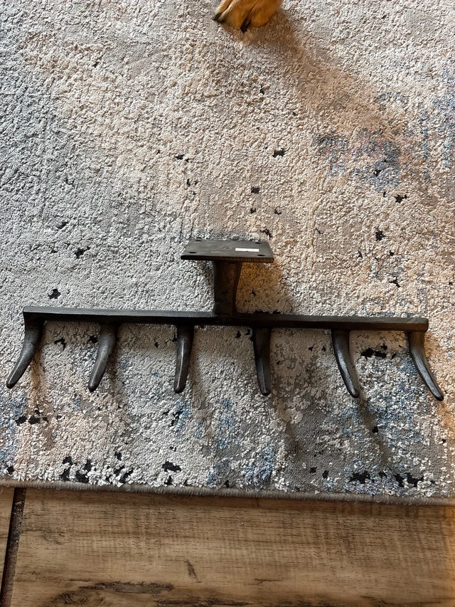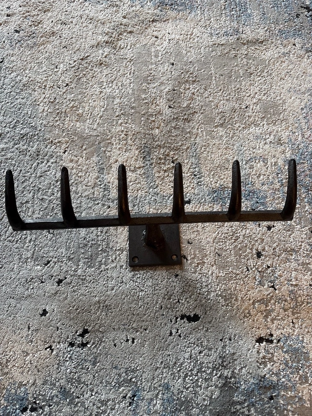 This unique garden rake coat hanger is a charming and functional piece, repurposed from a used garden rake, adding a rustic touch to any entryway or room. Its sturdy metal construction provides reliable support for coats, hats, or even lightweight gardening tools. This item is brand new and never been used. Repurposed garden rake. Sturdy metal construction. Perfect for coats, hats, or light tools. Cash accepted.