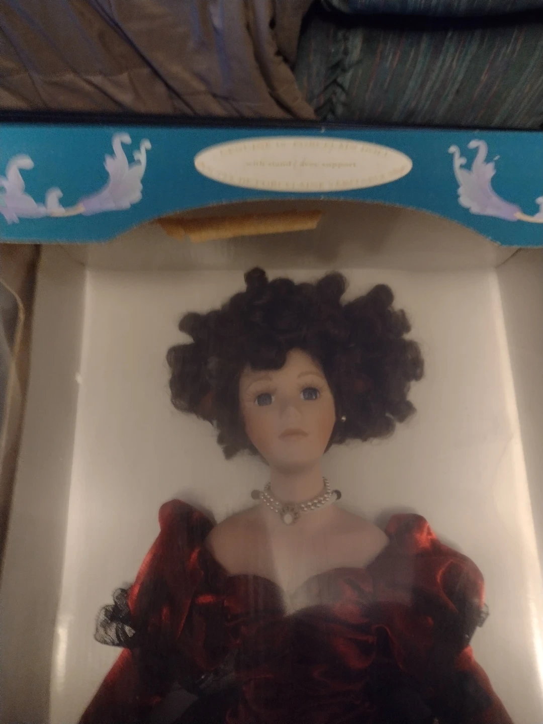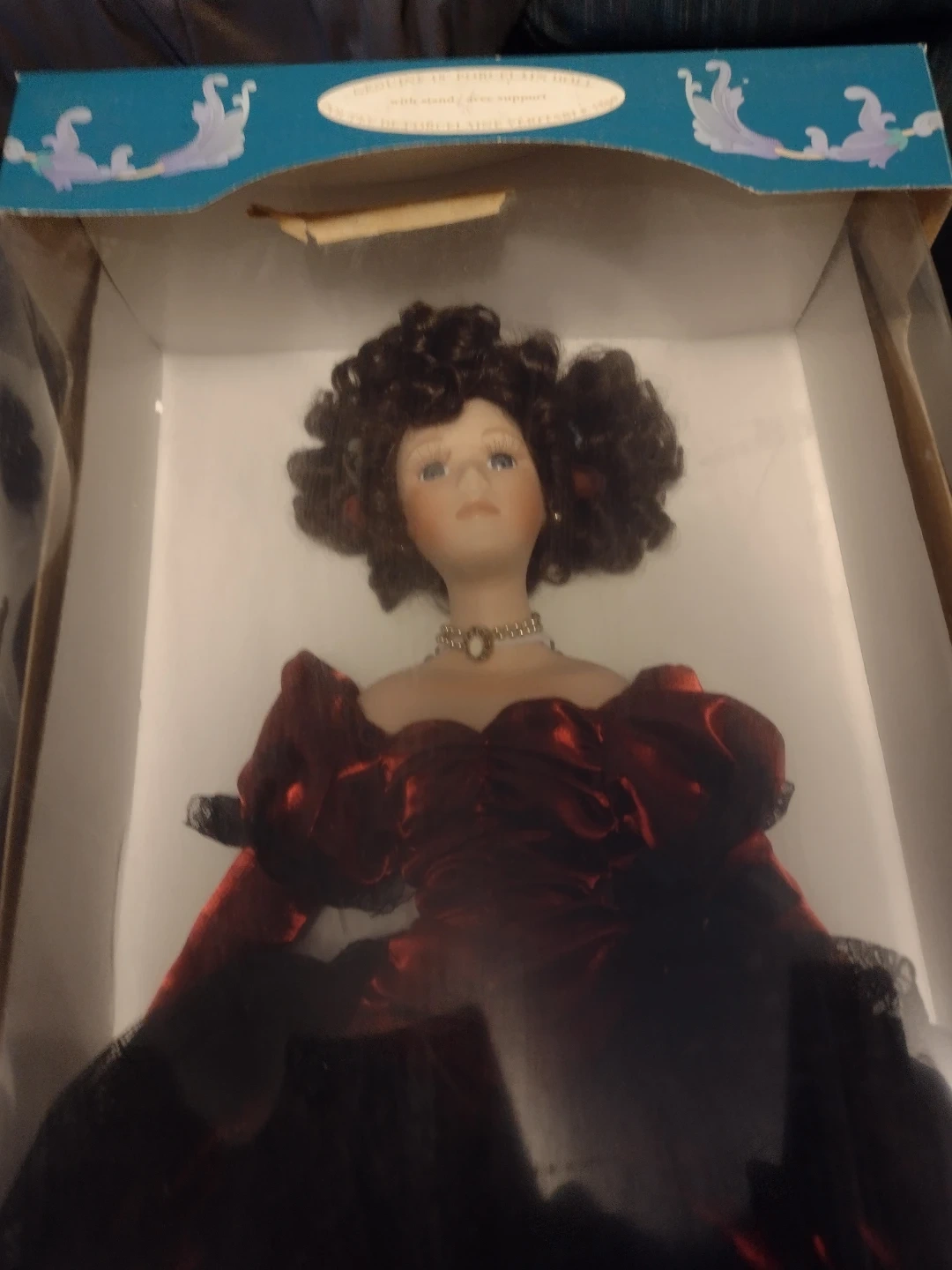 This is a collectible porcelain doll in a formal gown. It has dark curly hair and is wearing a pearl necklace. The doll comes in its original box.