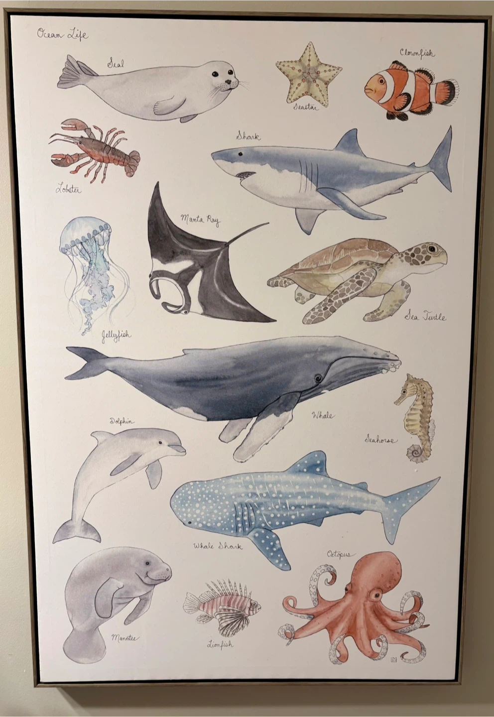 125Beautiful large canvas print for various sea creatures. Great piece for a child’s room or bathroom. Dimensions: 25L x 37H x 1.7H Pick up near Bermondsey & O’Connor or delivery with additional fee dependent on area.