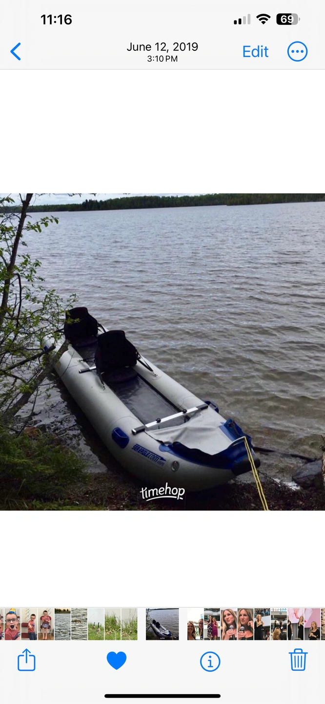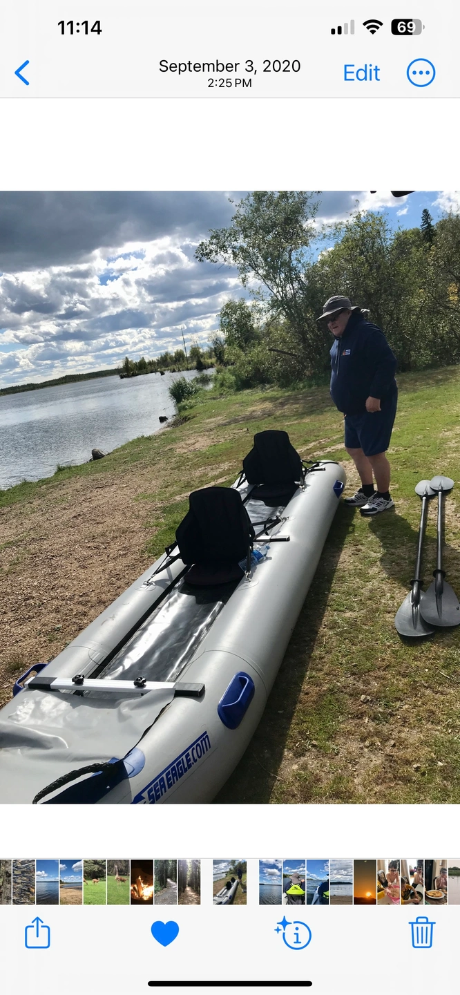 Length 14’6” Width 39” Weight 41 lbs Two widely spaced Inflatable tubes for directional stability, that cut right through the water , giving you a solid, well balanced , un-tip-able, well balanced boat. 16 D-Rings to secure seats and gear.Three aluminum yokes for rigid structure. Two rear carry handles & bow handle. Wide beam hull designed for stability. Inflates in minutes with included foot pump. Folds down into easy carry case. Sit on Top/ Open Cockpit Solo, Tandem . Average Adult,Larger Adult, for all skill levels. NMMA CERTIFIED. For more information on Sea Eagle brand , check out Sea Eagle . Com Excellent condition