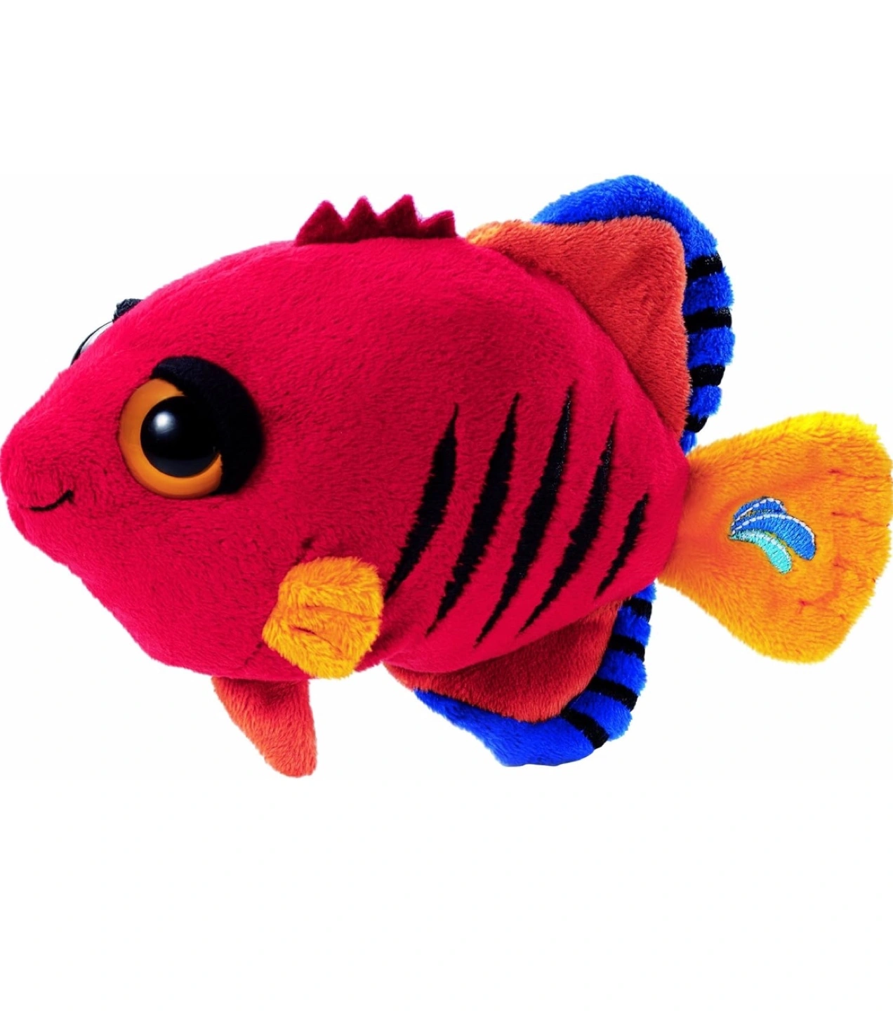 57Small, colourful plush toy. Features a red body, yellow and orange fins, and blue detailing. Soft and cuddly. Perfect for collectors or children.