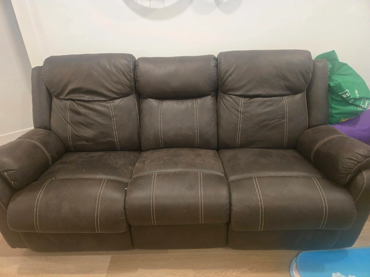 Three-seater reclining sofa in a dark brown faux leather finish. It features contrasting white stitching detail on the seat cushions and backrests. This sofa has a plush, comfortable design with overstuffed armrests. It's a great piece for a living room or rec room!