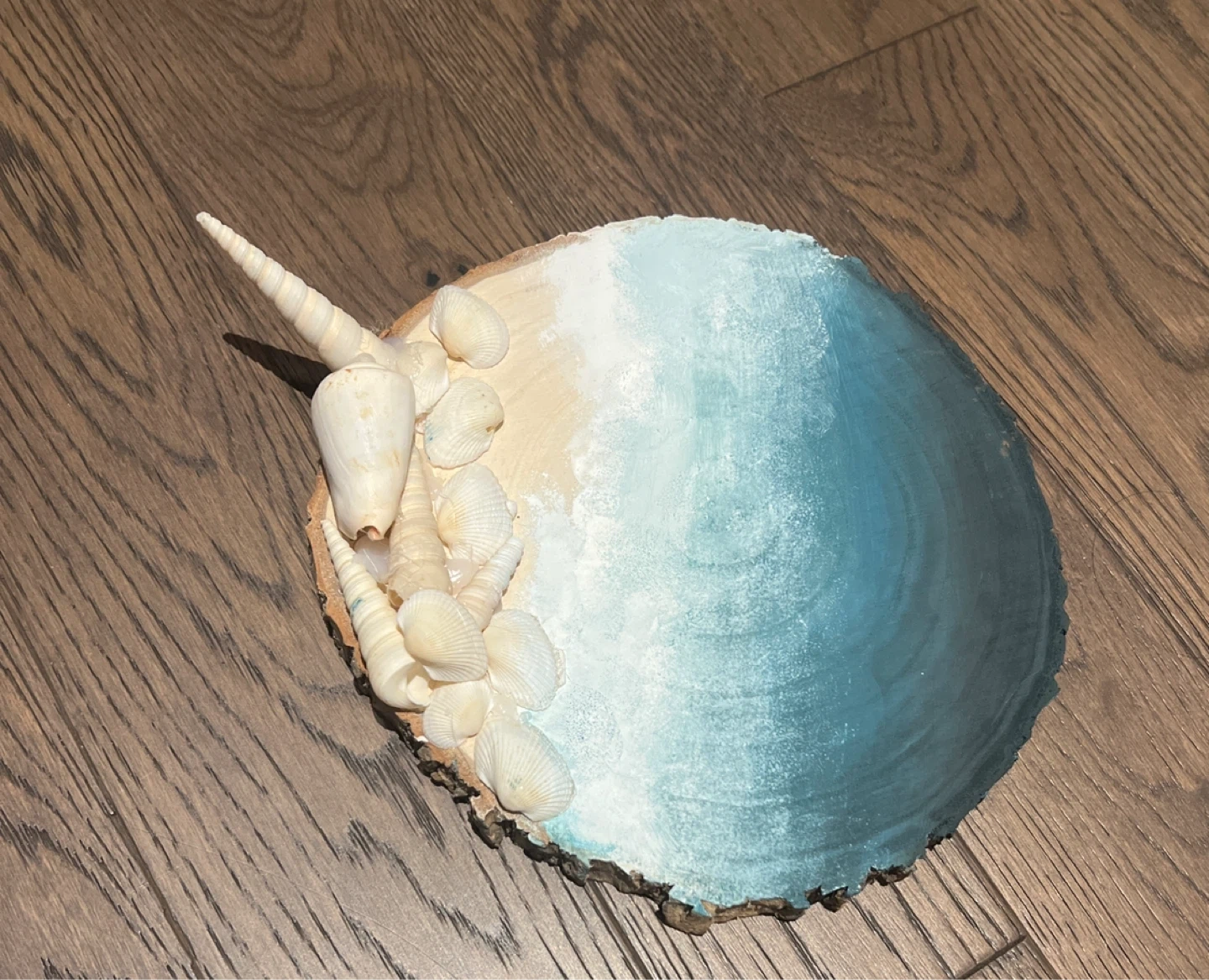 5Unique handmade art piece featuring seashells arranged on a painted wood slice. Perfect for adding a coastal vibe to your home decor!