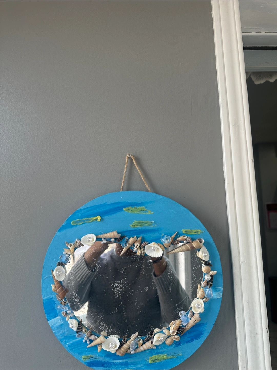 5Selling a cute, handmade mirror decorated with seashells! It's got a light blue painted base and would be perfect for a beach-themed room or just to add a little coastal charm to your home