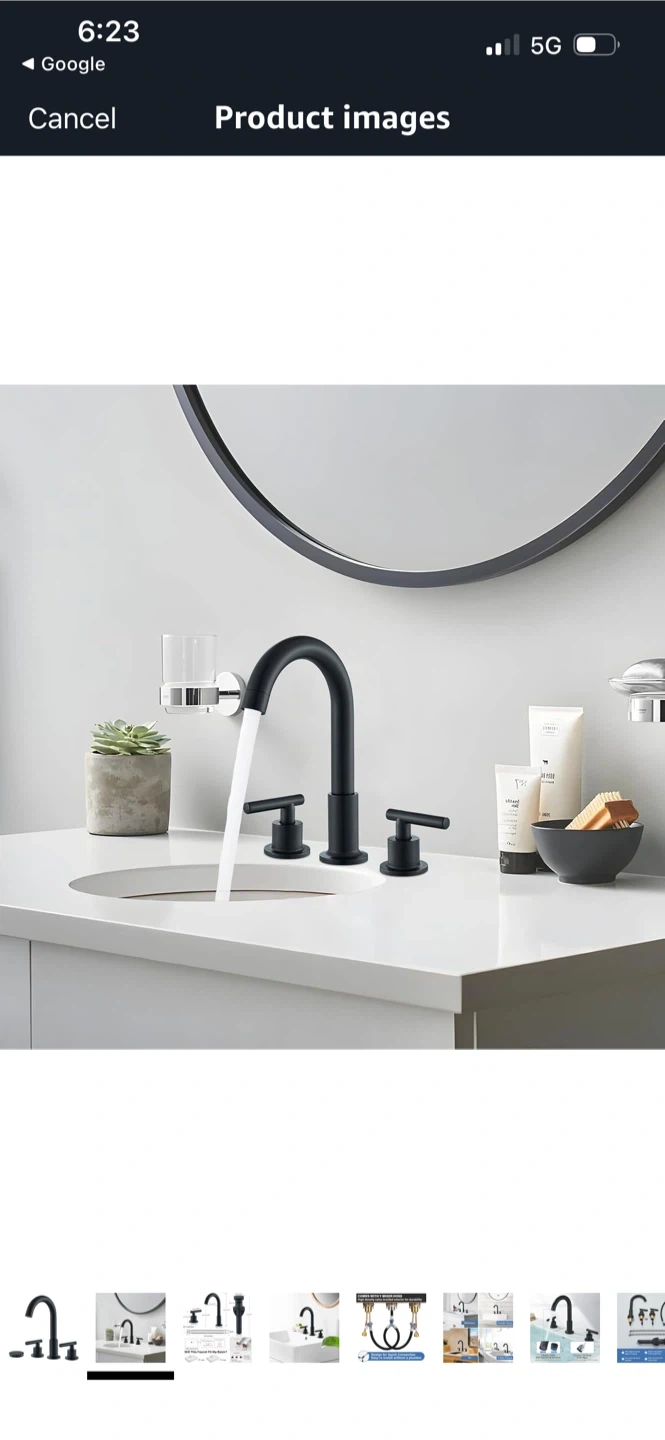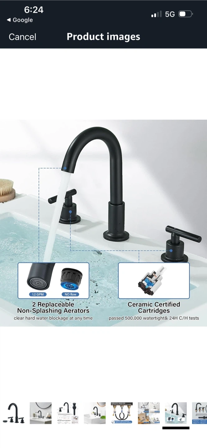 This matte black bathroom faucet features a widespread design with two T-handle controls. It includes a drain assembly and a Y mixer hose made with a high-density nylon braided exterior for durability. It's designed for quick connection, making installation easy without a plumber.