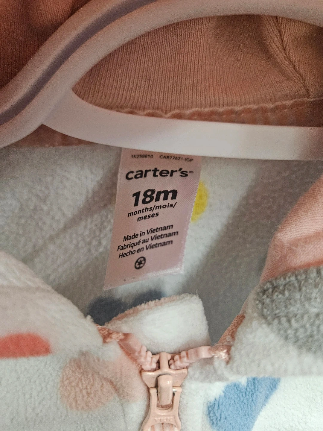 Cozy Carter's fleece bunting suit for baby girls. It features a cute all-over heart print in pink, blue, and yellow. The full zipper makes for easy changes and there's a handy front pocket. Perfect for keeping your little one warm and snug!