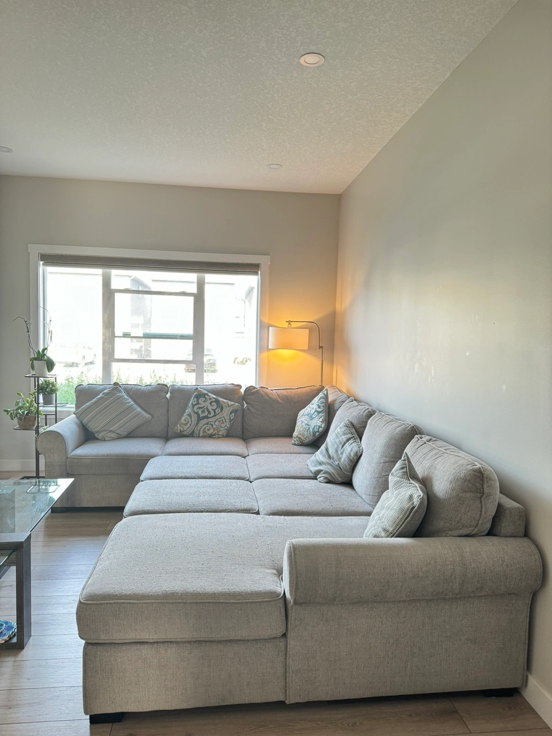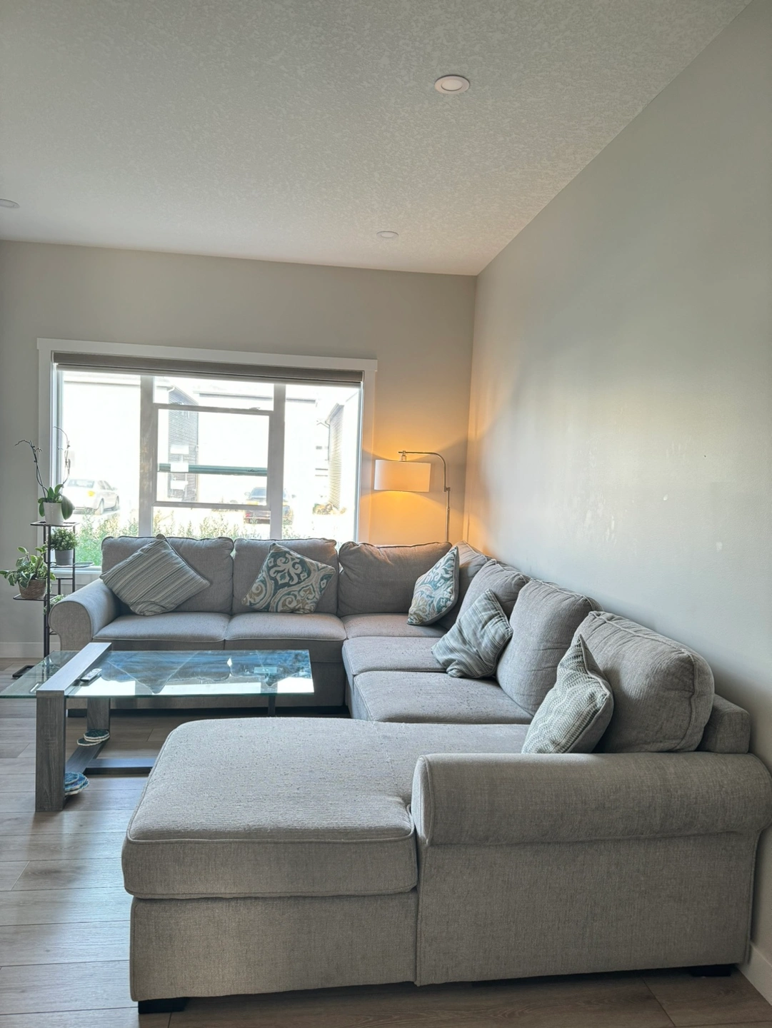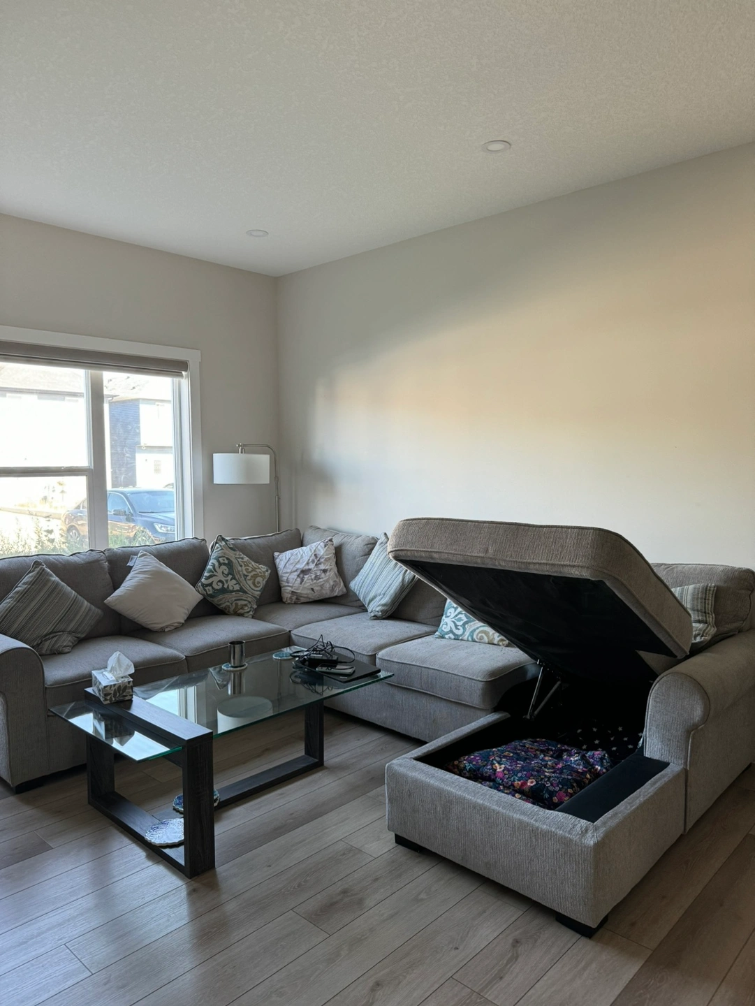 26This is a grey sectional sofa with a chaise. It is a very comfortable sofa that has been well-loved by our family. It comes with storage and turns to a decent bed for any of your guests coming by. All cushions are included in the deal . The sofa has usually been wear and tear and has lint on it . The coffee table is pretty new and has just minor scratches on the glass. Open to selling only the sofa as well . Message me for the price if you need only the sofa and not the table.