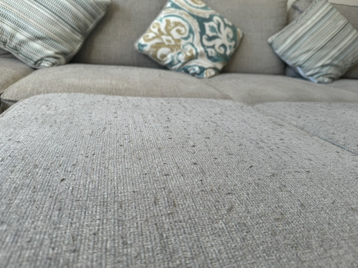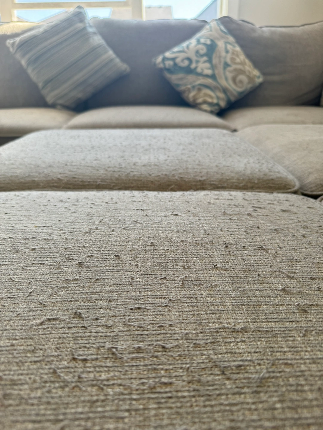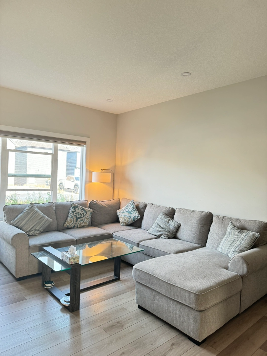 26This is a grey sectional sofa with a chaise. It is a very comfortable sofa that has been well-loved by our family. It comes with storage and turns to a decent bed for any of your guests coming by. All cushions are included in the deal . The sofa has usually been wear and tear and has lint on it . The coffee table is pretty new and has just minor scratches on the glass. Open to selling only the sofa as well . Message me for the price if you need only the sofa and not the table.