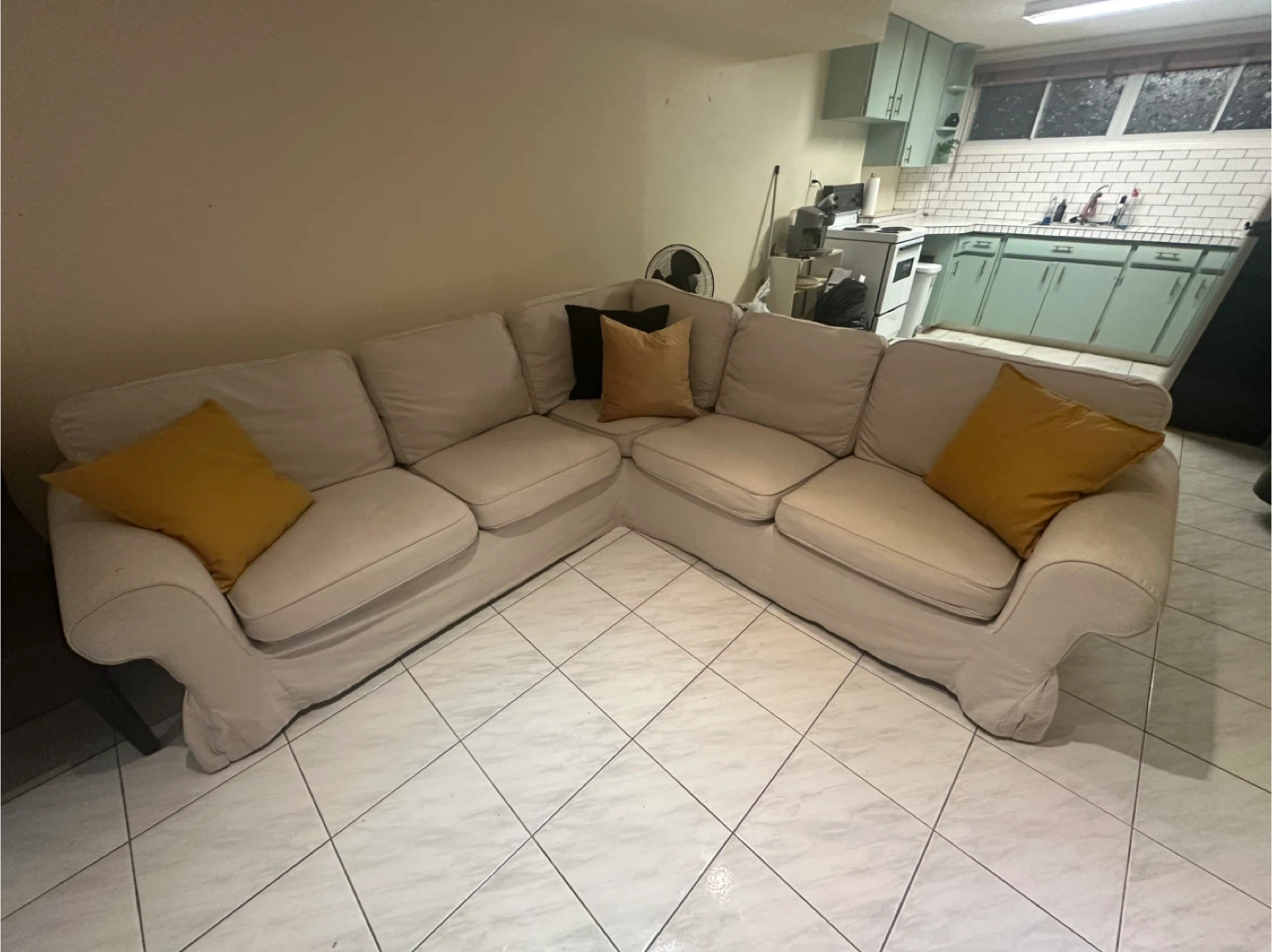 111Selling a comfy sectional sofa! It's beige in colour and would be perfect for a living room or den. There are some signs of use, as shown in the photos. There’s a burn on one of the covers but the other side of the cushion is fine. Decorative cushions NOT INCLUDED