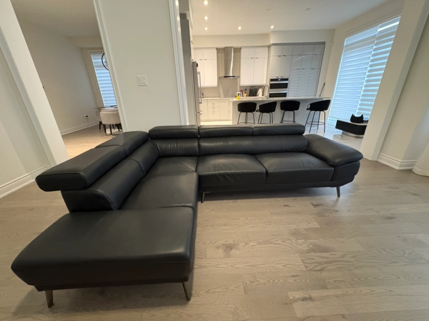 73Black, leather sectional sofa. I’m happy to negotiate the price! Preferably pick up only, but I’m sure we can work something out. Head rests can be lifted up or down