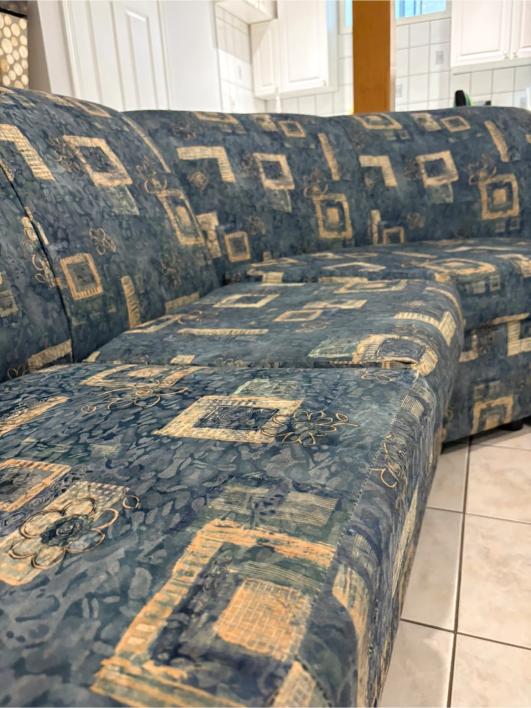 42Looking to sell this comfy sectional sofa. It features a unique blue fabric with a patterned design. It's in good condition and perfect for a living room or family room. The sofa is a sectional, offering plenty of seating space for everyone