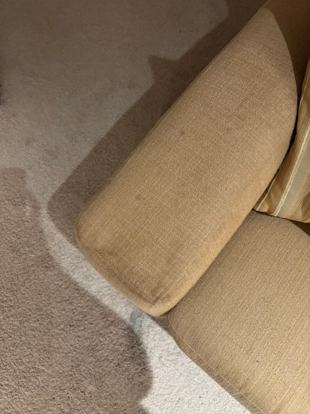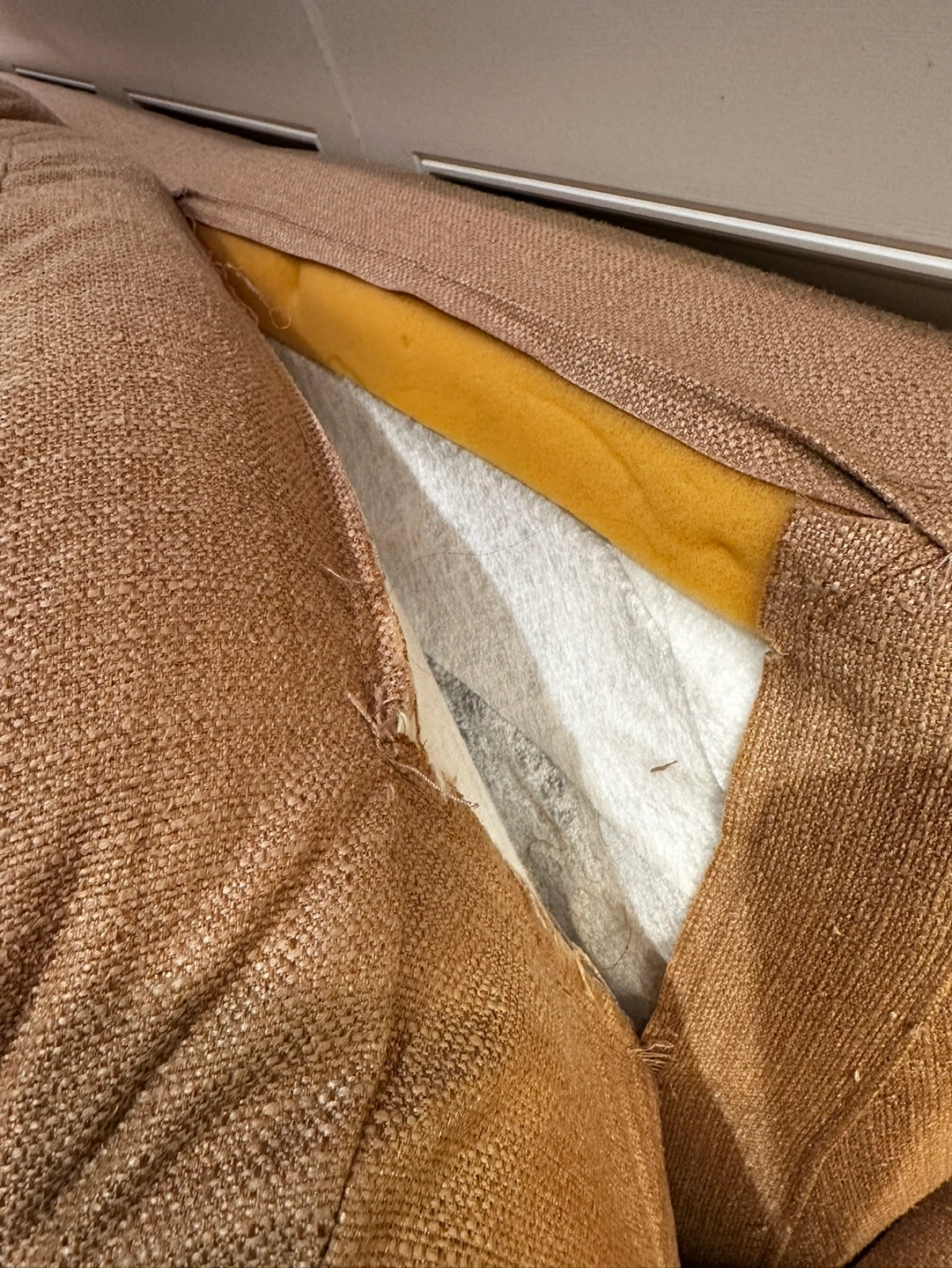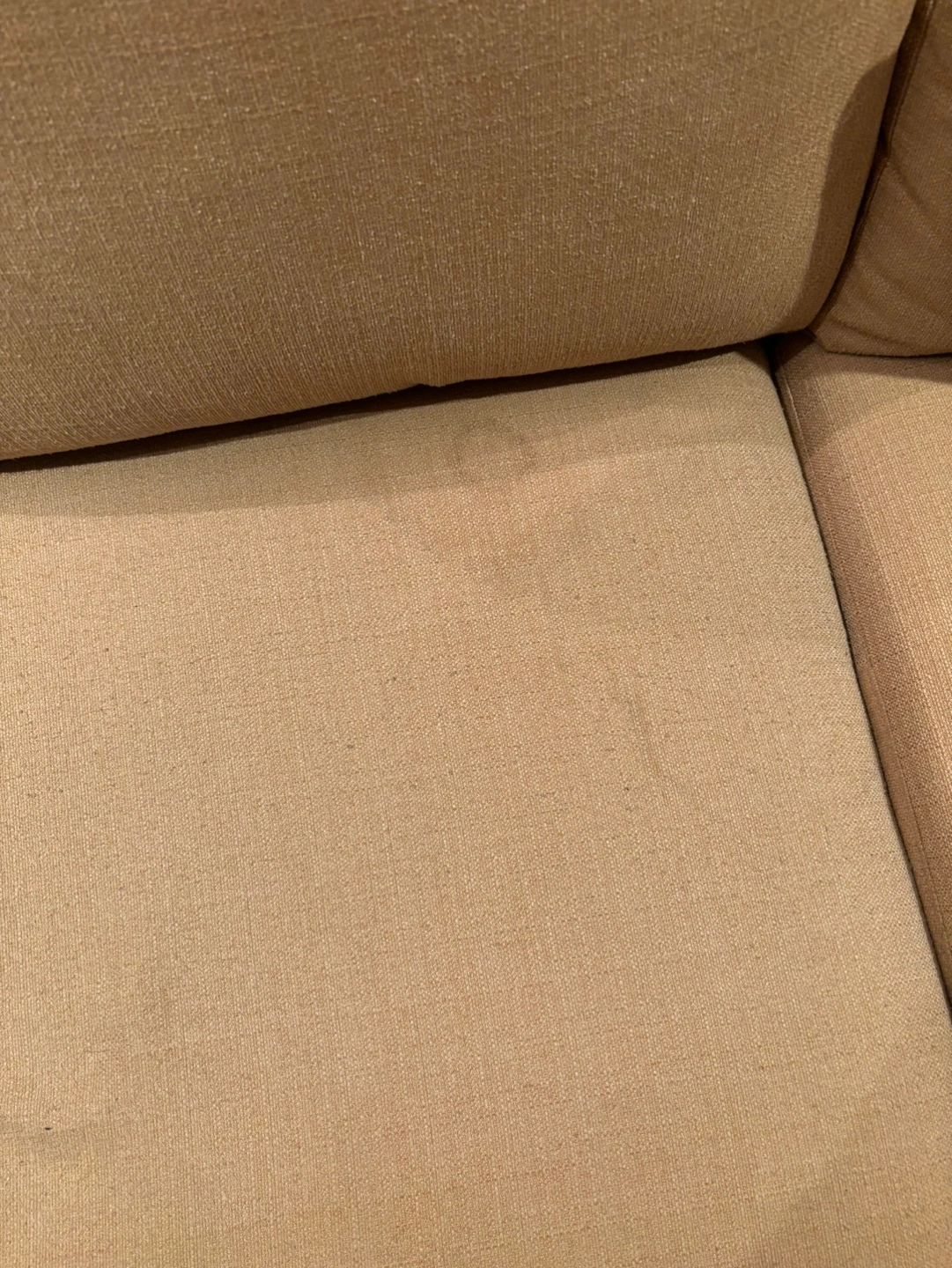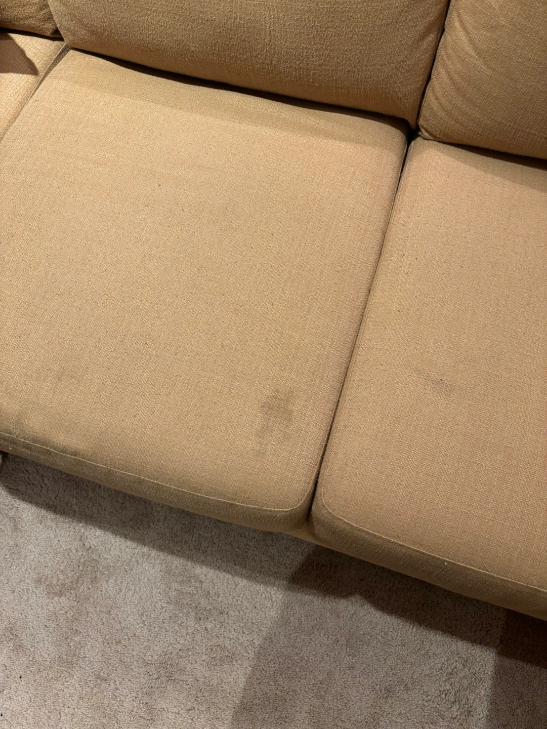 30Large sectional sofa in a beige fabric. The sectional is in a L shape with a chaise on the right side (it can be switched to a seat) Pick up only. Found a tear in the back so reduced the price, some mild stains, removable seat covers