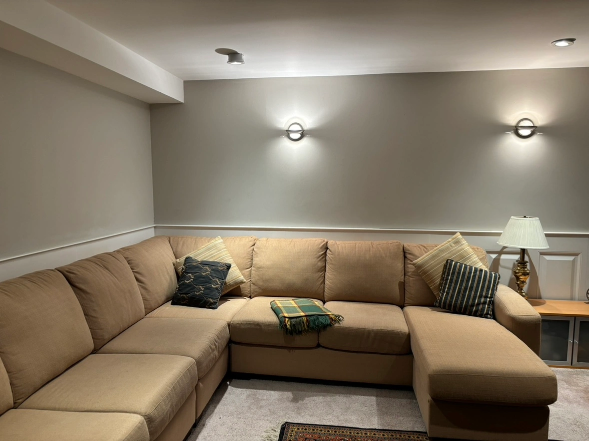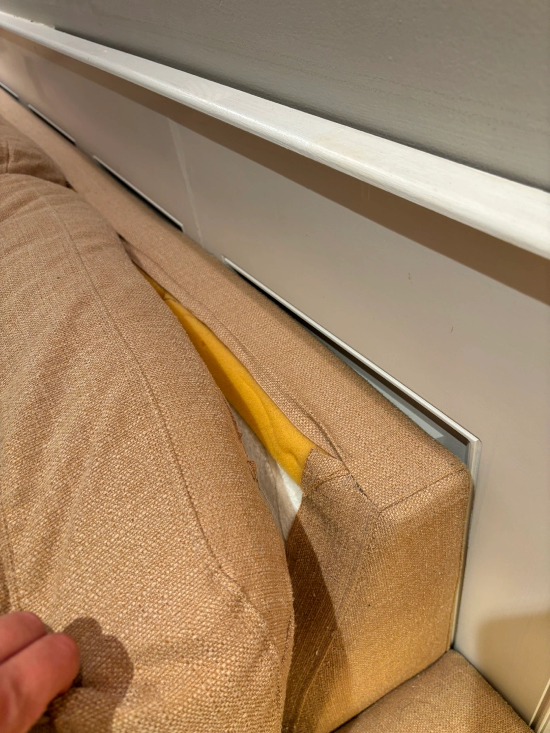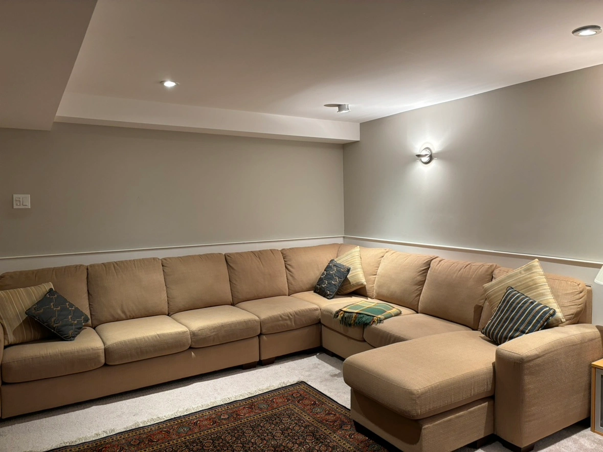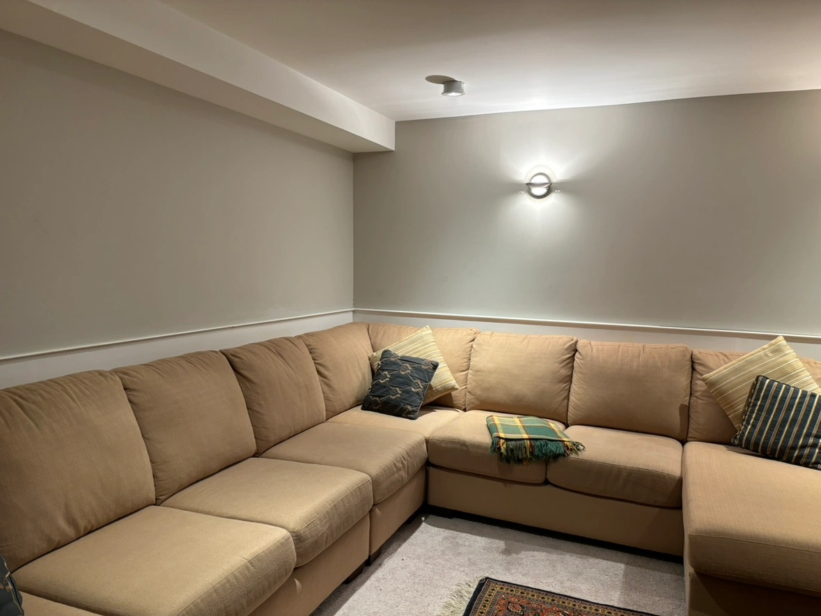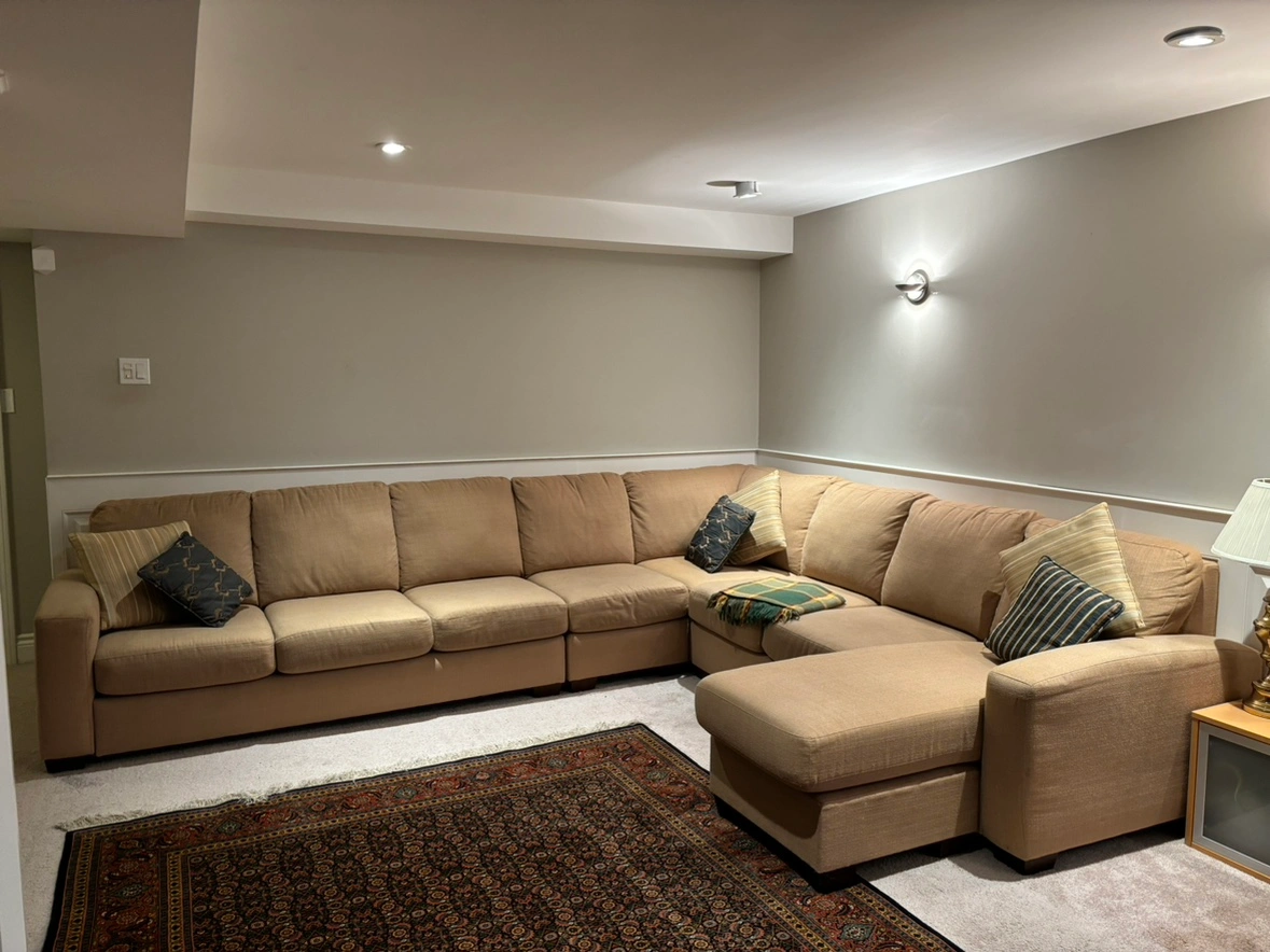 30Large sectional sofa in a beige fabric. The sectional is in a L shape with a chaise on the right side (it can be switched to a seat) Pick up only. Found a tear in the back so reduced the price, some mild stains, removable seat covers