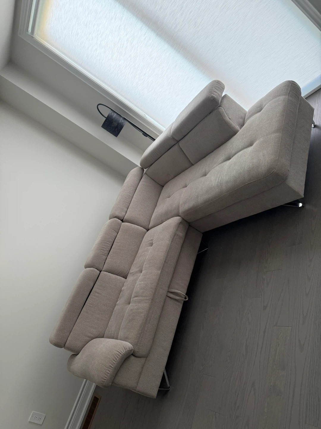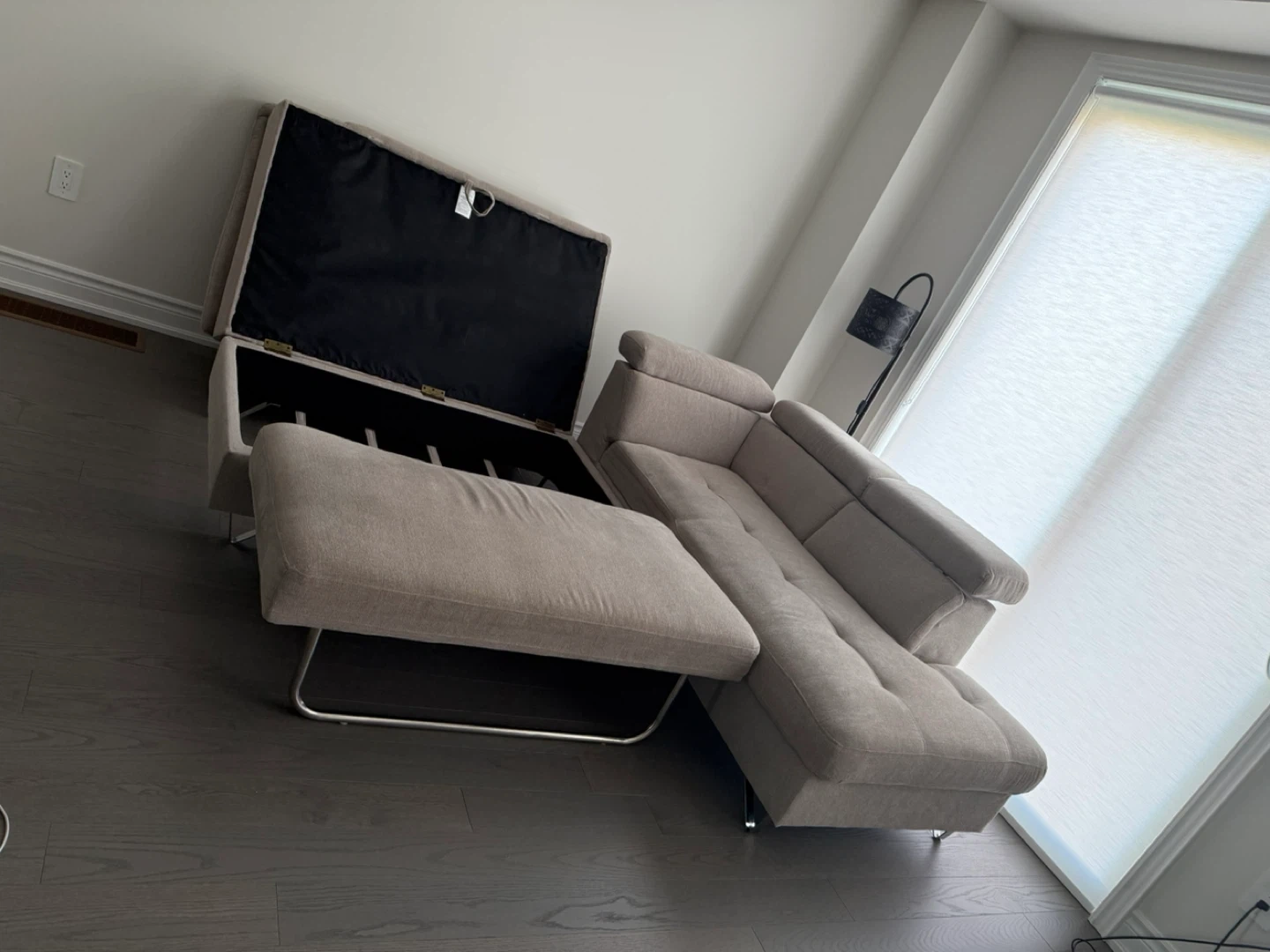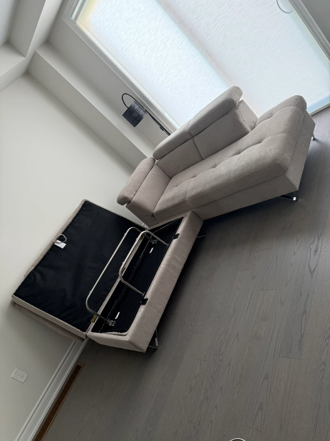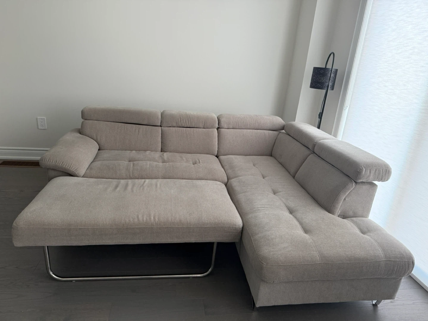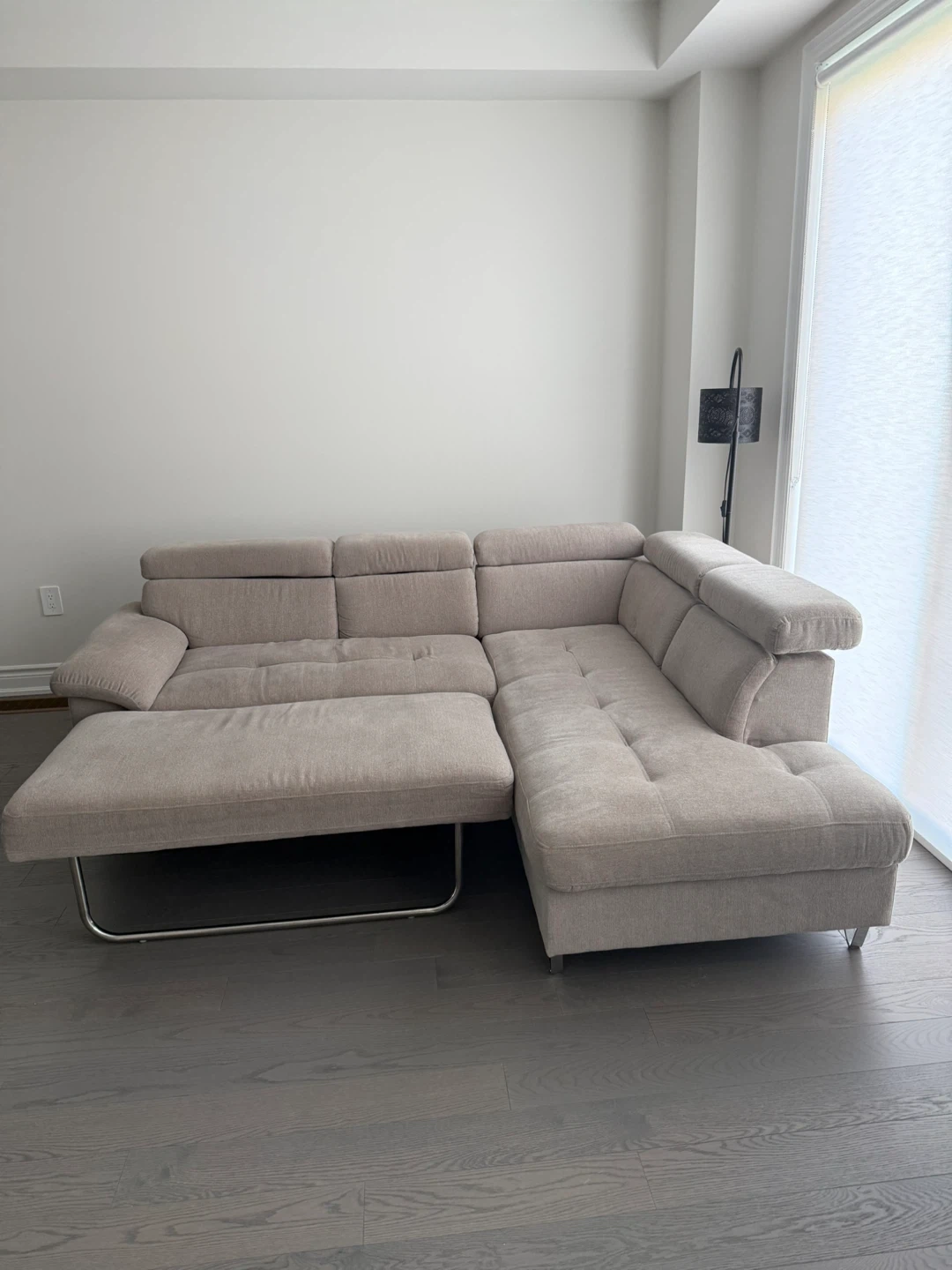Selling a sectional sofa with a comfy pullout! It's in great condition and perfect for lounging. It's a neutral colour that would fit in with any decor