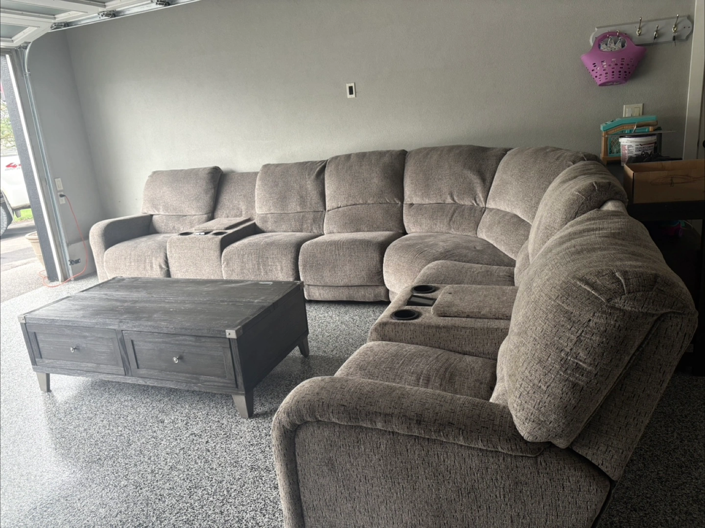 Selling a comfortable sectional sofa. It features reclining seats and convenient cup holders, perfect for relaxing evenings at home. The sofa is in good condition and ready for a new home!
