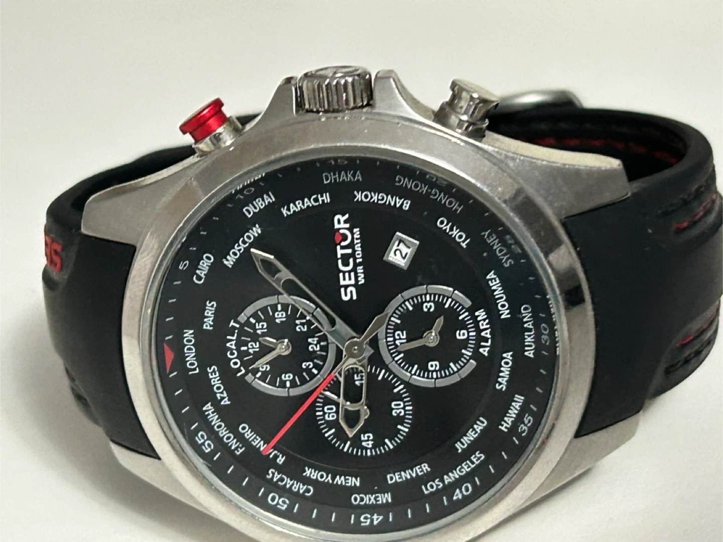 Selling a Sector No Limits 380 watch. It features a black rubber strap with red stitching and a stainless steel case. The face displays multiple time zones