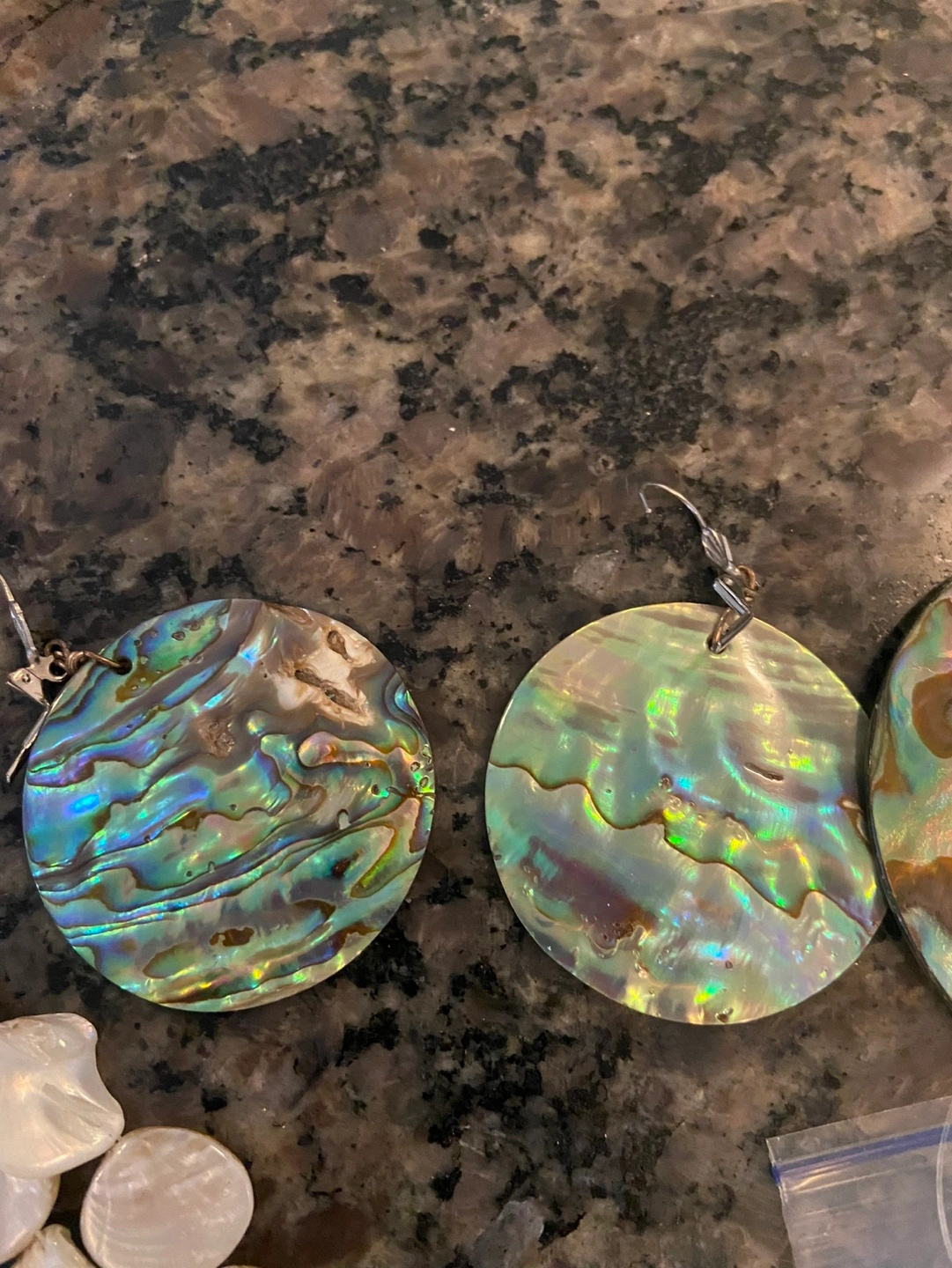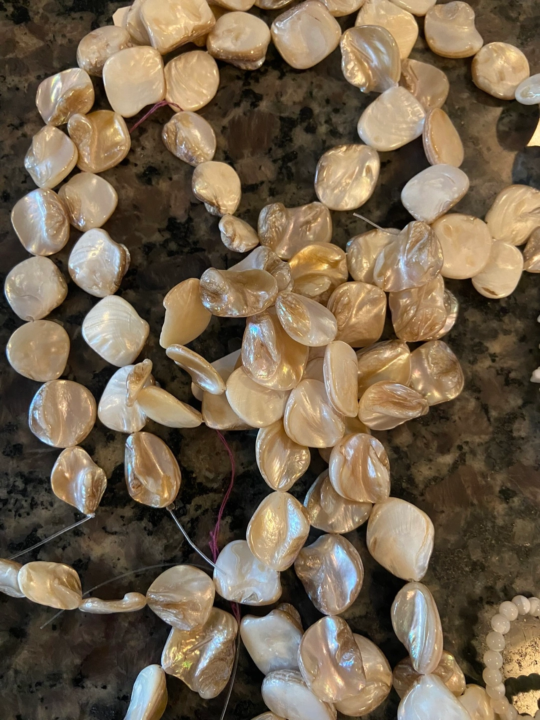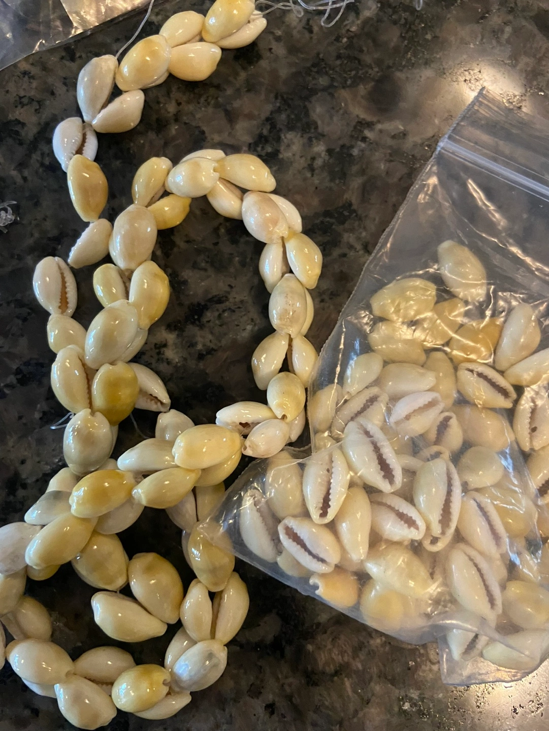 Large collection of shell beads and pendants. Includes various shapes, sizes, and colours. Some strung, some loose. Great for jewellery making.