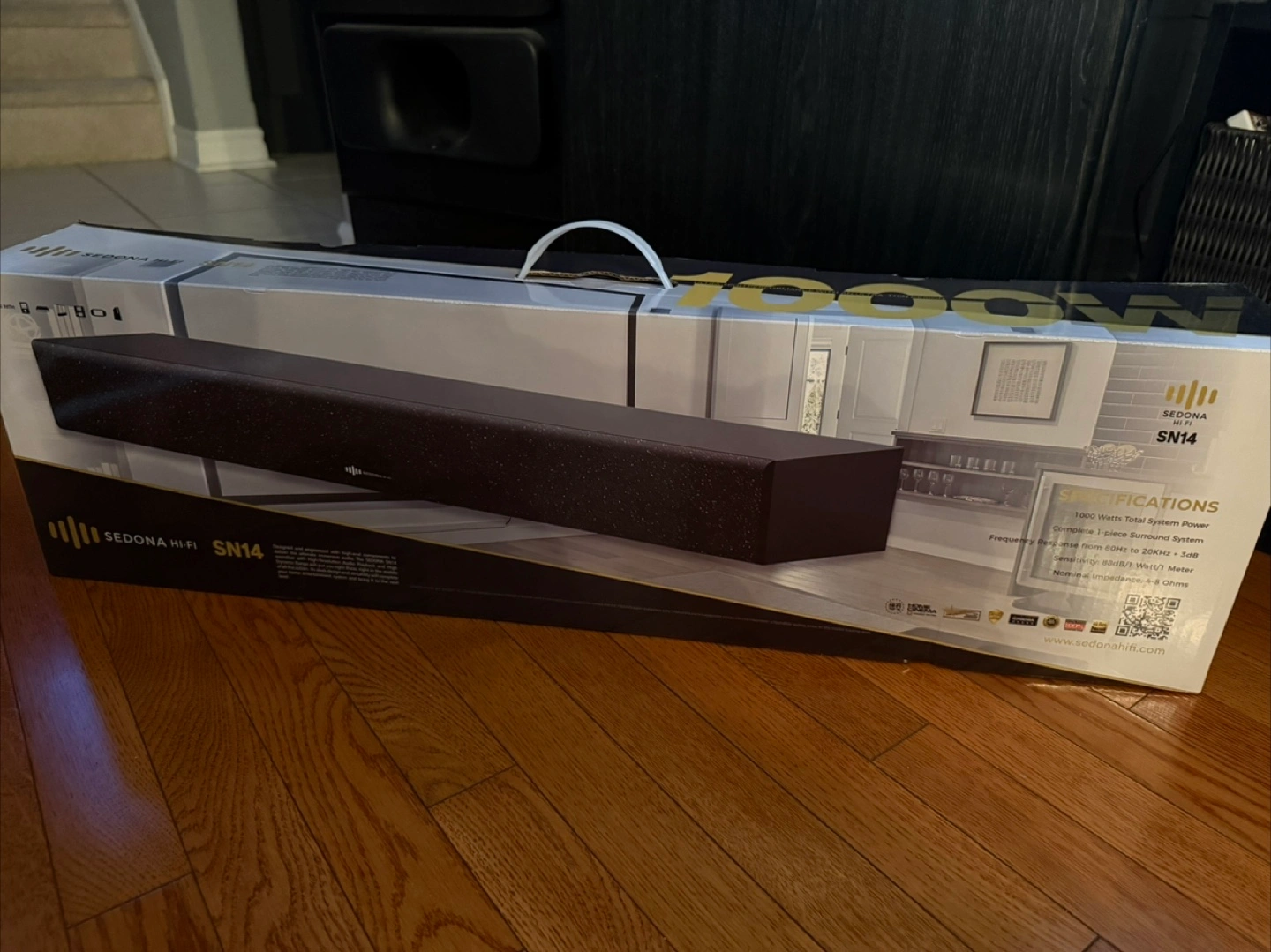 New but openbox valued at $1500. Selling a Sedona HiFi SN14 soundbar. It's a great addition to any home theatre setup! The box includes specifications such as 100W total system power and a frequency response from 60Hz to 20KHz. The impedance is 4-8 Ohms