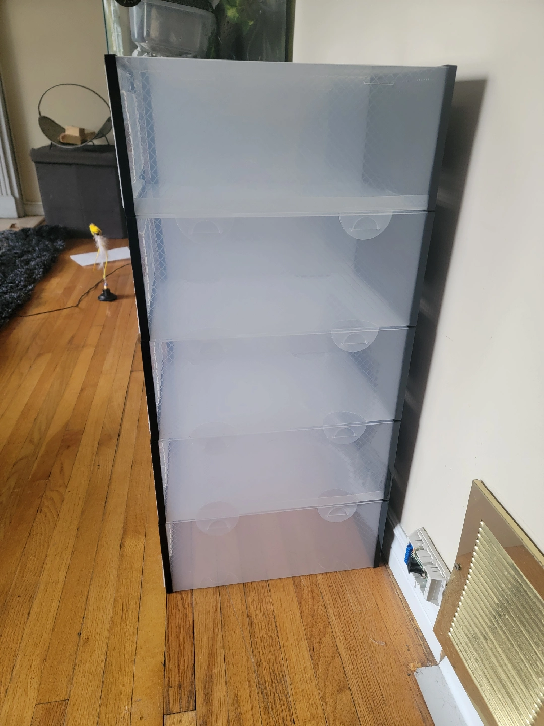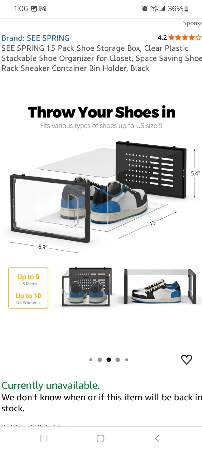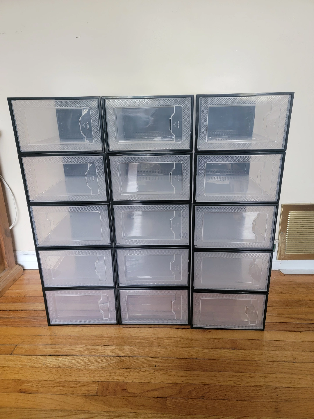 Selling a set of 15 SEE SPRING shoe storage boxes in black! They're clear plastic and stackable, perfect for organizing your closet and saving space. Each container can fit shoes up to a US size 9.