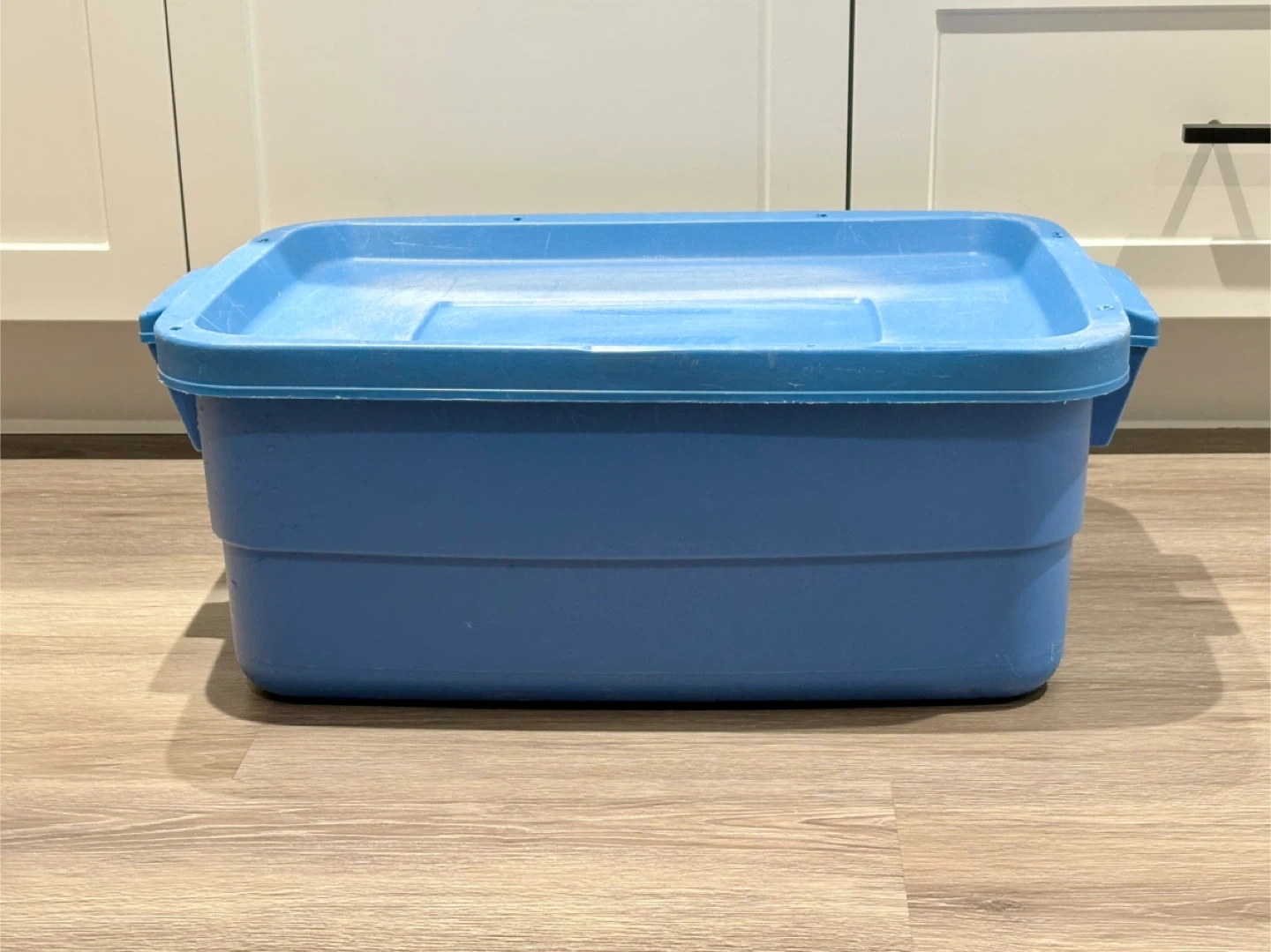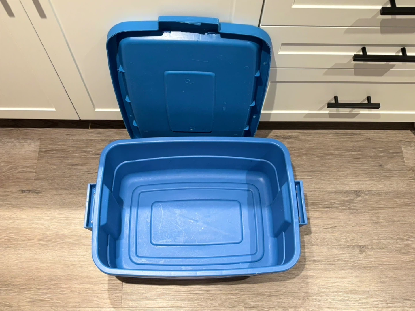 Blue Rubbermaid Roughneck storage bin with lid. It's made of durable plastic. This bin is great for organizing different items around the house.