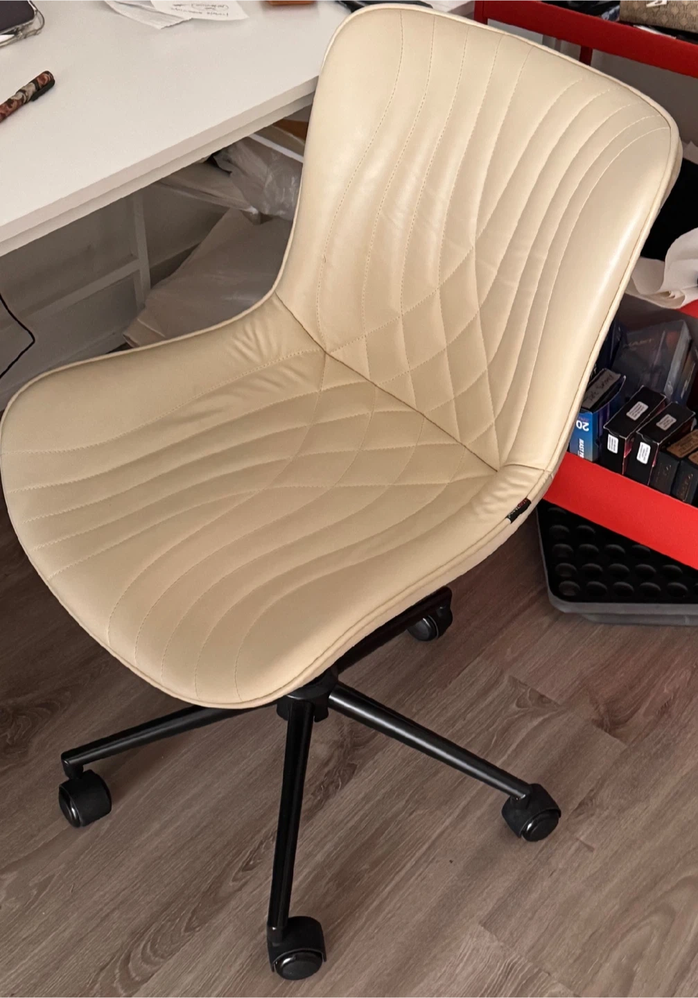 This office chair has a stylish cream upholstery with a quilted pattern. It's built with a sturdy black base and casters for easy mobility. The chair offers comfortable seating for your workspace.